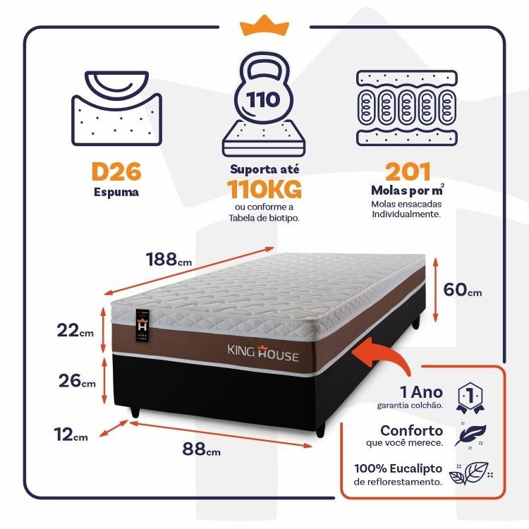 Dica Importante Gostou do produto, mas o tamanho não se encaixa à sua necessidade? Não tem problema, o Conjunto Cama Box Venice está disponível em 5 medidas com 4 variações de cores nos box para que se adapte a qualquer ambiente. Nada melhor do que dormir confortavelmente, seja sozinho ou com seu parceiro, com um amplo espaço e conforto, não é mesmo?! Medidas do Colchão: 88x188x22 cm, 96X203x22 cm, 138x188x22 cm, 158x198x22, 193x203x22 cm. Medidas Colchão + Box: 88x188x60 cm, 96X203x60 cm,138x188x60 cm, 158x198x60 cm, 193x203x60 cm. Cores do Colchão: Marrom; Cores do Box: Branco PU, Cinza, Marrom e Preto. Caso você tenha interesse em visualizar os anúncios de alguma das opções acima, basta efetuar uma busca de acordo com as opções descritas. Introdução ao Produto: Sabe aquela sensação de felicidade e satisfação que você sente quando faz uma boa escolha?! Pois bem, essa é a sensação de comprar um Conjunto Cama Venice. Um produto moderno com design elegante, que irá transformar para sempre suas noites de sono :) Feito com os mais nobres materiais em sua composição, ele conta com espuma D26 e molas ensacadas. Por ser mais macio, o colchão de molas ensacadas individualmente traz benefícios e ajuda no alinhamento da coluna. O colchão King House acomoda melhor o contorno do corpo, dispondo de forma correta quadris e ombros, expulsando as dores e problemas de coluna. Não perca mais tempo e garanta já o seu colchão Venice! Características: - Espuma D26; - 201 molas por m2 ensacadas individualmente; - Suporta até 120 kg por pessoa. Características do Box: - 100% eucalipto; - Pés com 12 cm de altura; Dimensões: - Altura: 22 cm (colchão) + 26 cm (box) + 12 cm (pés) = 60 cm de altura; - Largura : 88 cm; - Comprimento: 188 cm. Conteúdo da embalagem: - 01 Colchão Solteiro Venice Marrom; - 01 Box - 04 Pés de PVC - 01 Certificado de garantia. - 01 Manual de montagem. Garantia: 1 ano de garantia nas molas, 1 ano de garantia nas espumas e 3 meses no revestimento. Informações Relevantes: - É imprescindível ter ciência de que é possível que haja divergência de tonalidade nos tecidos devido às variações de configurações de monitores/telas e lotes do fornecedor; - Não nos responsabilizamos pelo transporte por escadas, elevadores, guincho ou içamento deste produto, qualquer despesa é de responsabilidade do cliente; - Verifique as dimensões do produto, certificando-se de que o mesmo possa ser transportado por portas, corredores e elevadores; - Os objetos que decoram a imagem, não acompanham o produto; - Não nos responsabilizamos pela instalação e montagem; - Prestamos assistência somente por defeitos de fabricação. Nosso produto é certificado pelo INMETRO! CERTIFICADO DE CONFORMIDADE NÚMERO: 07424-001-02/2019 OCP: 003