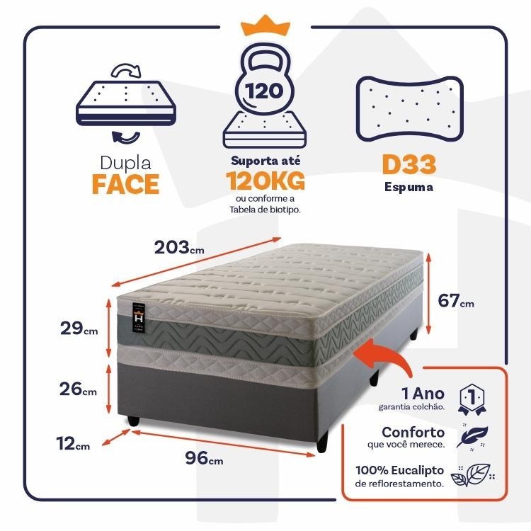 Dica Importante Gostou do produto, mas o tamanho não se encaixa à sua necessidade? Não tem problema, o Conjunto Cama Box Oxford está disponível em 5 medidas para que se adapte a qualquer ambiente. Nada melhor do que dormir confortavelmente, seja sozinho ou com seu parceiro, com um amplo espaço e conforto, não é mesmo?! Medidas do Colchão: 88x188x29 cm, 96X203x29 cm, 128x188x29 cm,138x188x29 cm, 158x198x29 cm, 193x203x29 cm. Medidas Colchão + Box: 88x188x67 cm, 96X203x67 cm, 138x188x67 cm, 158x198x67 cm, 193x203x67 cm. Cores do Colchão: Verde; Cores do Box: Branco PU, Cinza, Marrom e Preto. Caso você tenha interesse em visualizar os anúncios de alguma das opções acima, basta efetuar uma busca de acordo com as opções descritas. Introdução ao Produto: Sabe aquela sensação de felicidade e satisfação que você sente quando faz uma boa escolha?! Pois bem, essa é a sensação de comprar um Conjunto Cama Oxford. Um produto moderno com design elegante, que irá transformar para sempre suas noites de sono :) Feito com os mais nobres materiais em sua composição, ele conta com espuma D33 . O colchão King House acomoda melhor o contorno do corpo, dispondo de forma correta quadris e ombros, expulsando as dores e problemas de coluna. Não perca mais tempo e garanta já o seu colchão Oxford! Características: - Espuma D33; - Double face; - Peso Suportado: *Consultar tabela de biotipo nas imagens do produto. Características do Box: - 100% eucalipto; - Pés com 12 cm de altura; Dimensões: - Altura: 29 cm (colchão) + 26 cm (box) + 12 cm (pés) = 67 cm de altura; - Largura : 96 cm; - Comprimento: 203 cm. Conteúdo da embalagem: - 01 Colchão Solteiro Oxford Verde; - 01 Box - 06 Pés de PVC - 01 Certificado de garantia. - 01 Manual de montagem. Garantia: 1 ano de garantia nas espumas e 3 meses no revestimento. Informações Relevantes: - É imprescindível ter ciência de que é possível que haja divergência de tonalidade nos tecidos devido às variações de configurações de monitores/telas e lotes do fornecedor; - Não nos responsabilizamos pelo transporte por escadas, elevadores, guincho ou içamento deste produto, qualquer despesa é de responsabilidade do cliente; - Verifique as dimensões do produto, certificando-se de que o mesmo possa ser transportado por portas, corredores e elevadores; - Os objetos que decoram a imagem, não acompanham o produto; - Não nos responsabilizamos pela instalação e montagem; - Prestamos assistência somente por defeitos de fabricação. Nosso produto é certificado pelo INMETRO! CERTIFICADO DE CONFORMIDADE NÚMERO: 07424-001-02/2019 OCP: 003