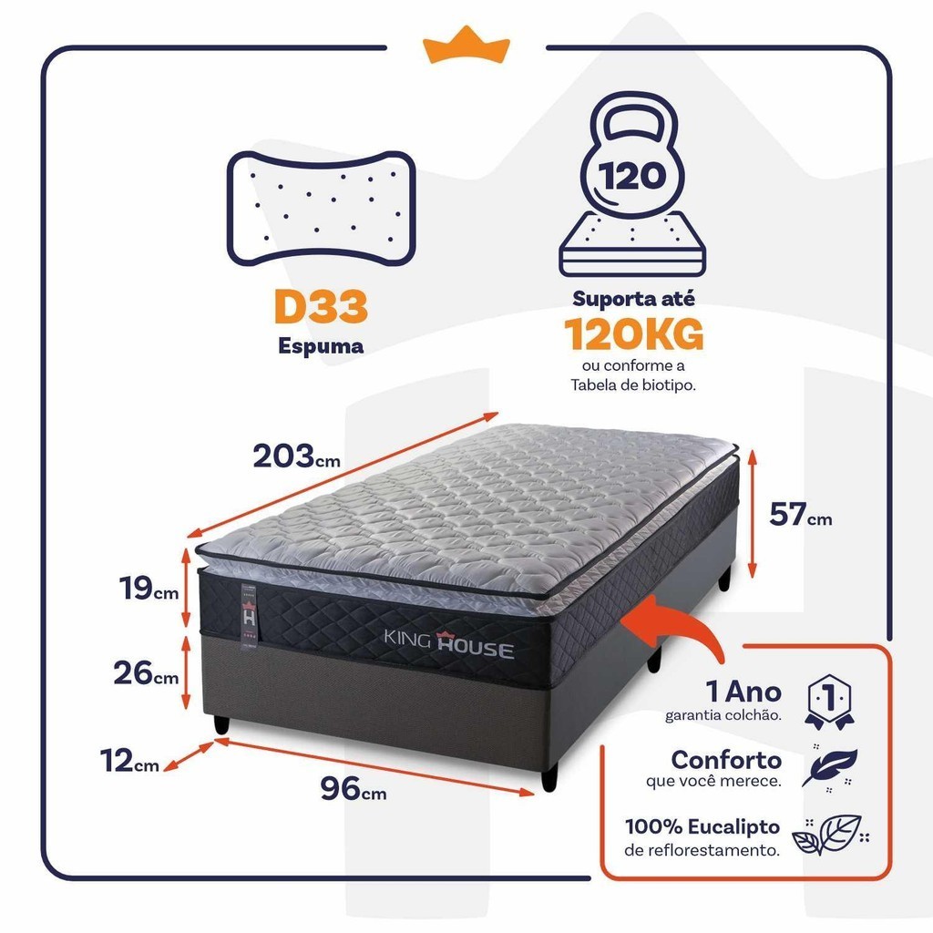 Dica Importante Gostou do produto, mas o tamanho não se encaixa à sua necessidade? Não tem problema, o Conjunto Cama Box Dakota está disponível em 5 medidas para que se adapte a qualquer ambiente. Nada melhor do que dormir confortavelmente, seja sozinho ou com seu parceiro, com um amplo espaço e conforto, não é mesmo?! Medidas do Colchão: 88x188x19 cm, 96X203x19 cm, 128x188x19 cm,138x188x19 cm, 158x198x19 cm, 193x203x19 cm. Medidas Colchão + Box: 88x188x57 cm, 96X203x57 cm, 128x188x57 cm, 138x188x57 cm, 158x198x57 cm, 193x203x57 cm. Cores do Colchão: Cinza; Cores do Box: Branco PU, Cinza, Marrom e Preto. Caso você tenha interesse em visualizar os anúncios de alguma das opções acima, basta efetuar uma busca de acordo com as opções descritas. Introdução ao Produto: Sabe aquela sensação de felicidade e satisfação que você sente quando faz uma boa escolha?! Pois bem, essa é a sensação de comprar um Conjunto Cama Dakota. Um produto moderno com design elegante, que irá transformar para sempre suas noites de sono :) Feito com os mais nobres materiais em sua composição, ele conta com espuma D33 . O colchão King House acomoda melhor o contorno do corpo, dispondo de forma correta quadris e ombros, expulsando as dores e problemas de coluna. Não perca mais tempo e garanta já o seu colchão Dakota! Características: - Espuma D33; - One face; - Peso Suportado: *Consultar tabela de biotipo nas imagens do produto. Características do Box: - 100% eucalipto; - Pés com 12 cm de altura; Dimensões: - Altura: 19 cm (colchão) + 26 cm (box) + 12 cm (pés) = 57 cm de altura; - Largura : 96 cm; - Comprimento: 203 cm. Conteúdo da embalagem: - 01 Colchão Solteiro Dakota Preto; - 01 Box - 06 Pés de PVC - 01 Certificado de garantia. - 01 Manual de montagem. Garantia: 1 ano de garantia nas espumas e 3 meses no revestimento. Informações Relevantes: - É imprescindível ter ciência de que é possível que haja divergência de tonalidade nos tecidos devido às variações de configurações de monitores/telas e lotes do fornecedor; - Não nos responsabilizamos pelo transporte por escadas, elevadores, guincho ou içamento deste produto, qualquer despesa é de responsabilidade do cliente; - Verifique as dimensões do produto, certificando-se de que o mesmo possa ser transportado por portas, corredores e elevadores; - Os objetos que decoram a imagem, não acompanham o produto; - Não nos responsabilizamos pela instalação e montagem; - Prestamos assistência somente por defeitos de fabricação. Nosso produto é certificado pelo INMETRO! CERTIFICADO DE CONFORMIDADE NÚMERO: 07424-001-02/2019 OCP: 003