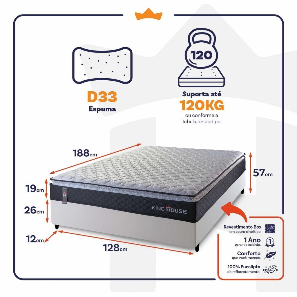 Dica Importante Gostou do produto, mas o tamanho não se encaixa à sua necessidade? Não tem problema, o Conjunto Cama Box Dakota está disponível em 5 medidas para que se adapte a qualquer ambiente. Nada melhor do que dormir confortavelmente, seja sozinho ou com seu parceiro, com um amplo espaço e conforto, não é mesmo?! Medidas do Colchão: 88x188x19 cm, 96X203x19 cm, 128x188x19 cm,138x188x19 cm, 158x198x19 cm, 193x203x19 cm. Medidas Colchão + Box: 88x188x57 cm, 96X203x57 cm, 128x188x57 cm, 138x188x57 cm, 158x198x57 cm, 193x203x57 cm. Cores do Colchão: Cinza; Cores do Box: Branco PU, Cinza, Marrom e Preto. Caso você tenha interesse em visualizar os anúncios de alguma das opções acima, basta efetuar uma busca de acordo com as opções descritas. Introdução ao Produto: Sabe aquela sensação de felicidade e satisfação que você sente quando faz uma boa escolha?! Pois bem, essa é a sensação de comprar um Conjunto Cama Dakota. Um produto moderno com design elegante, que irá transformar para sempre suas noites de sono :) Feito com os mais nobres materiais em sua composição, ele conta com espuma D33 . O colchão King House acomoda melhor o contorno do corpo, dispondo de forma correta quadris e ombros, expulsando as dores e problemas de coluna. Não perca mais tempo e garanta já o seu colchão Dakota! Características: - Espuma D33; - One face; - Peso Suportado: *Consultar tabela de biotipo nas imagens do produto. Características do Box: - 100% eucalipto; - Pés com 12 cm de altura; Dimensões: - Altura: 19 cm (colchão) + 26 cm (box) + 12 cm (pés) = 57 cm de altura; - Largura : 128 cm; - Comprimento: 188 cm. Conteúdo da embalagem: - 01 Colchão Solteiro Dakota Preto; - 01 Box - 04 Pés de PVC - 01 Certificado de garantia. - 01 Manual de montagem. Garantia: 1 ano de garantia nas espumas e 3 meses no revestimento. Informações Relevantes: - É imprescindível ter ciência de que é possível que haja divergência de tonalidade nos tecidos devido às variações de configurações de monitores/telas e lotes do fornecedor; - Não nos responsabilizamos pelo transporte por escadas, elevadores, guincho ou içamento deste produto, qualquer despesa é de responsabilidade do cliente; - Verifique as dimensões do produto, certificando-se de que o mesmo possa ser transportado por portas, corredores e elevadores; - Os objetos que decoram a imagem, não acompanham o produto; - Não nos responsabilizamos pela instalação e montagem; - Prestamos assistência somente por defeitos de fabricação. Nosso produto é certificado pelo INMETRO! CERTIFICADO DE CONFORMIDADE NÚMERO: 07424-001-02/2019 OCP: 003