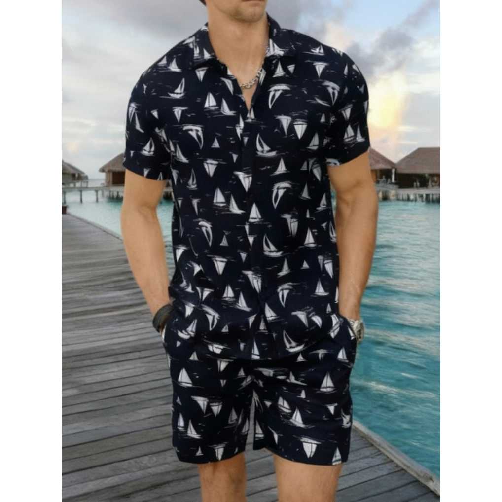 Conjunto Camisa e Short Florido Havaiano Estampado Floral Adulto Masculino Tecido de Viscose