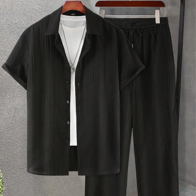 Conjunto Camisa Social Masculina Sólida com Botões e Calça com Cordão na Cintura Sem Camiseta