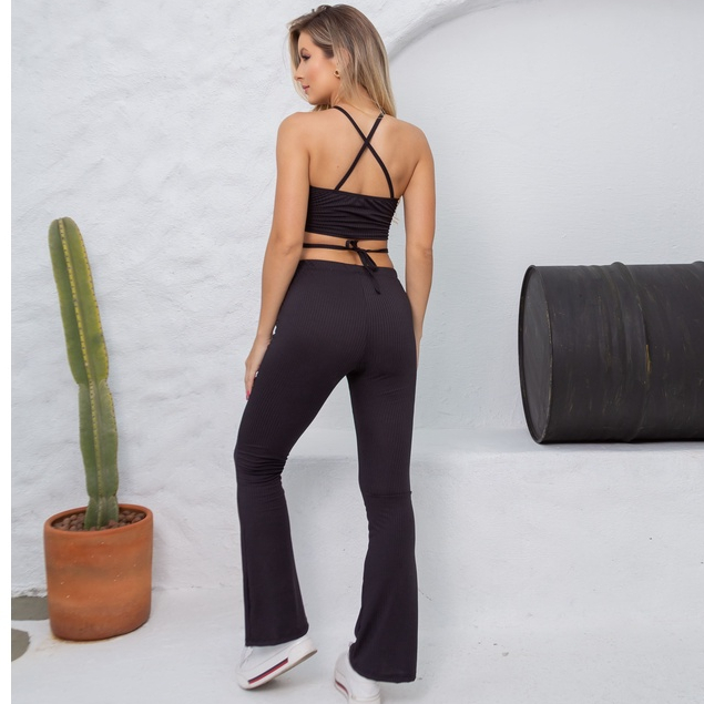 Conjunto Canelado Preto Feminino - Conjunto de Calça e Top com Cruzado do Pescoço