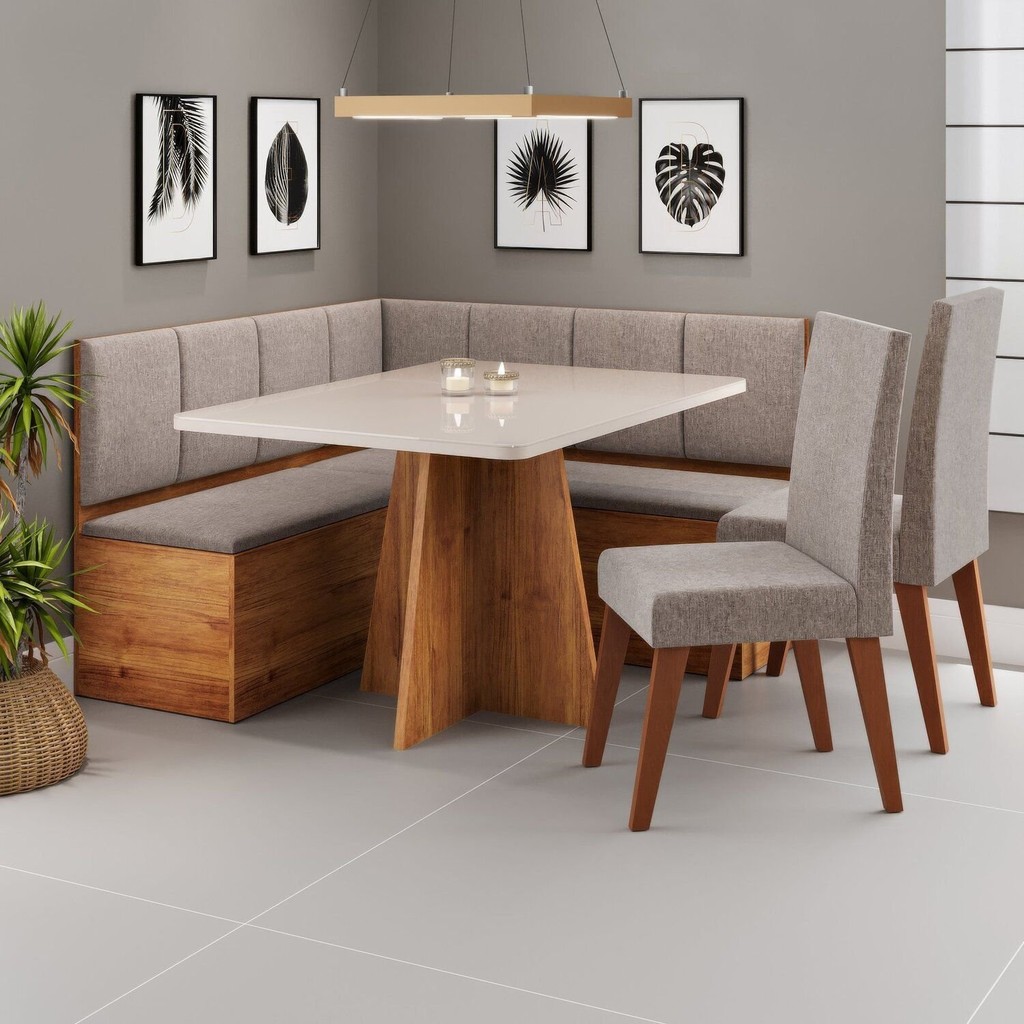 Conjunto Canto Alemão com Baú Mesa 120x77,8cm Tampo com Vidro e 2 Cadeiras Milão Kaki/Mel/Off White