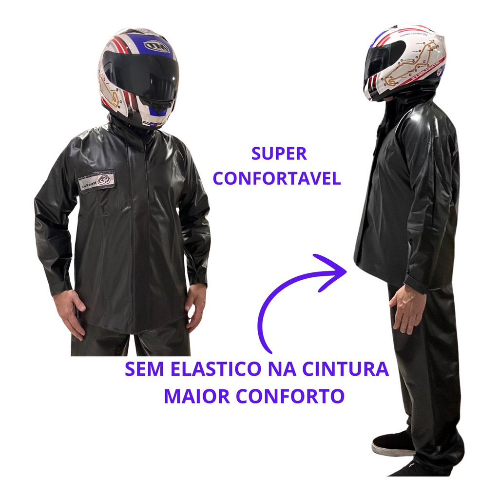 CONJUNTO CAPA DE CHUVA MOTO RACE sem elastico no blusao Conjunto motociclista, confeccionado em PVC forrado 028mm, 100% impermeável, na cor preta, composto por: Blusão de segurança com gola alta. Mangas longas raglãn com ajuste no punho por velcro. Fechamento frontal por meio de zíper e velcro, carcela interna para proteção do zíper, bolso interno, bolso externo no peito com manga fechada por velcro, elástico a cintura. Refletivo nas costas e na tampa do bolso Calça de segurança com elástico na cintura, zíper nos tornozelos para ajustes. Certificação O conjunto motociclista se enquadra dentro da NR6, por ser considerado um equipamento de proteção individual – EPI. Possui certificado de aprovação. Aprovado para proteção dos usuários em atividades com uso de água e precipitação pluviométrica. CUIDADOS: Lavar com água e sabão neutro, usar preferencialmente o método de lavagem manual, caso utilize a maquina de lavar colocar na posição de roupas delicadas, secar a sombra em local fresco e arejado. Não utilizar produtos químicos. MEDIDAS: TAMANHOS: P : ALTURA 1.45 CM M: ALTURA 1.56 CM G: ALTURA 1.70 CM GG: ALTURA 1.80 CM EXG: ALTURA 1.95 CM MEDIDAS DOS BLUSÕES Tamanho Comprimento Largura na cintura P 0,68 X 0,57 M 0,72 X 0,58 G 0,73 X 0,59 GG 0,78 X 0,61 EXG 0,78 X 0,63 MEDIDAS DAS CALÇAS Tamanho Comprimento Largura na cintura P 1,07 X 0,50 M 1,09 X 0,53 G 1,11 X 0,54 GG 1,14 X 0,57 EXG 1,14 X 0,62 DUVIDAS ESTAMOS A DISPOSIÇÃO