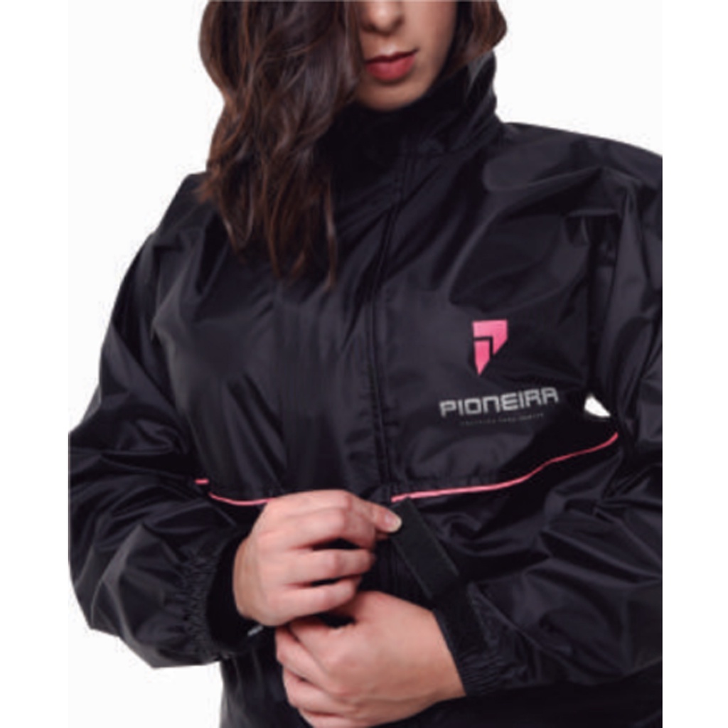 Conjunto Capa de Chuva Feminino Preto Impermeável Motoqueiro Nylon 0,20mm Pioneira - 1101-F-PRE O nosso produto de nylon mais completo! A jaqueta conta com fechamento através de zíper e velcro recobertos por lapela de drenagem, capuz embutido, pala de ventilação, bolso interno em zíper, regulador com velcro e elástico nos punhos, bainha em corda elástica, cinto regulador de cintura (no feminino) e viés refletivo + “P” refletivo nas costas. A calça conta com elástico na cintura, bolso externo, viés prata na lateral (rosa no feminino) e zíper com viés refletivo. Características- Marca: Pioneira - Modelo: 1101*Imagens Meramente Ilustrativas Especificações Técnicas: - Cor: Preto - Tamanho: Vários Conteúdo da Embalagem: - 1x jaqueta - 1x calça