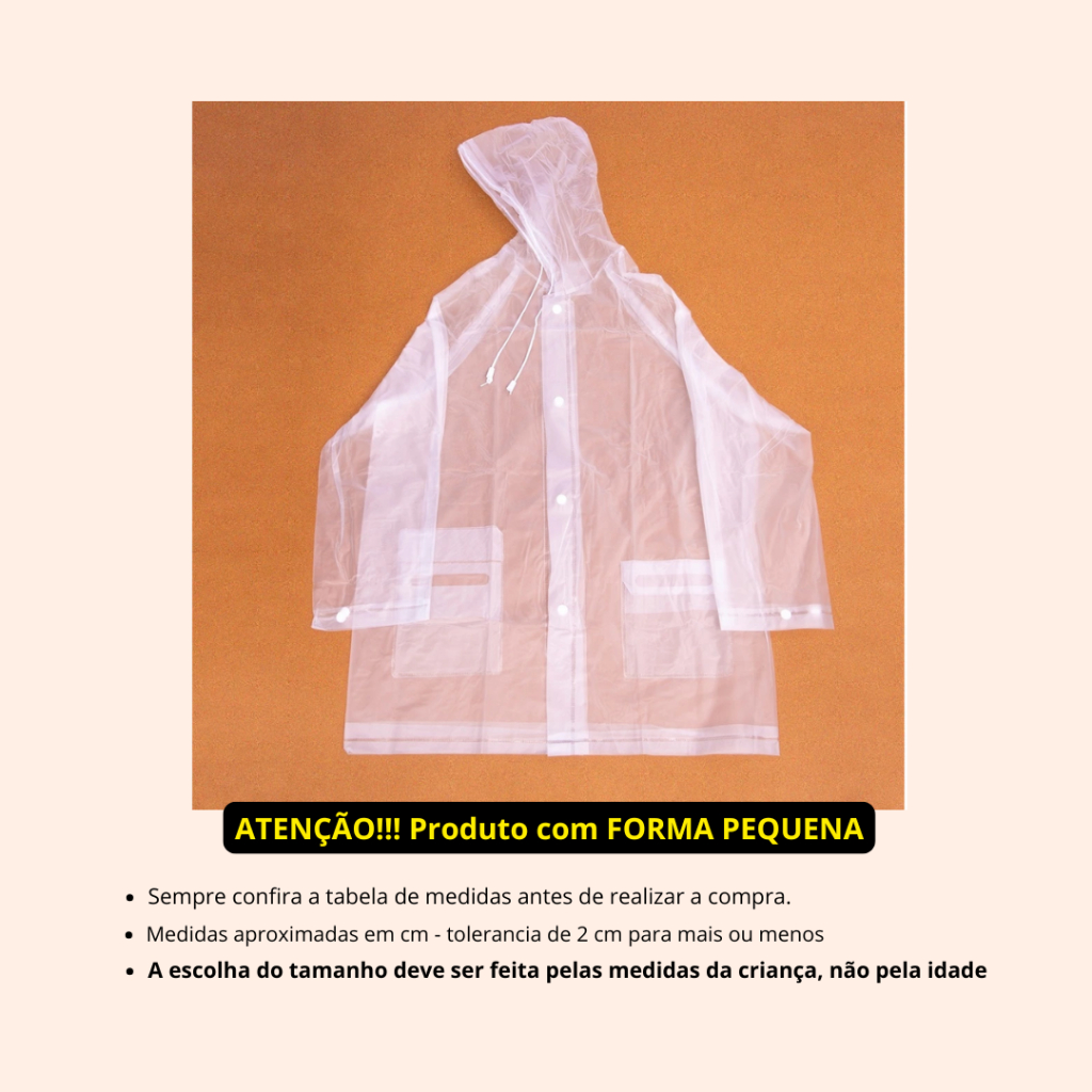 Conjunto Capa de Chuva INFANTIL com Capuz – Blusa e Calça | Classe ****** ATENÇÃO ÀS MEDIDAS!! - PRODUTO TEM FORMA PEQUENA, por isso é muito importante conferir a tabela de medidas nas fotos do anúncio antes da compra. - A tabela de medidas está disponível nas fotos do anúncio. - A escolha do tamanho deve ser feita pelas MEDIDAS da criança, não pela idade. TAMANHOS DISPONÍVEIS (Infantil): A escolha do tamanho deve ser feita pelas MEDIDAS da criança, não pela idade. O número é apenas uma referência e não corresponde a idade 10 anos, por exemplo. ****** Produto INFANTIL de Excelente Custo-Benefício!! Ideal para proteger a criança da chuva no dia a dia. ESPECIFICAÇÃO: - Marca: Classe - Conjunto com 2 peças: blusa com capuz + calça - Material 100% PVP reforçado - Protege contra chuva, respingos de água e vento - Leve, prático e fácil de vestir - Indicado para uso escolar, passeios e atividades externas Em caso de dúvidas, estamos à disposição para ajudar.