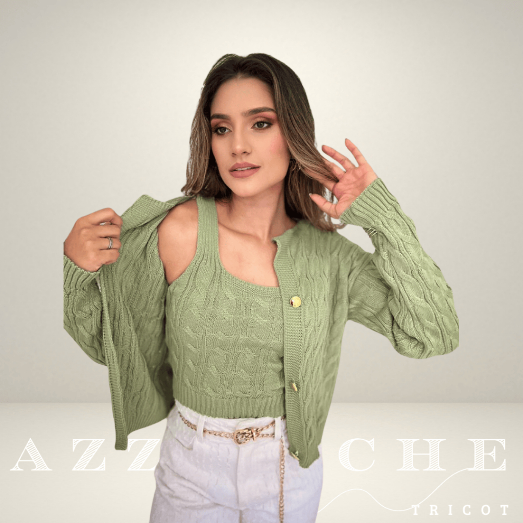 Conjunto Casaco Feminino de Tricô Cardigan com Botões e Tranças + Regata Tricot Twin set de Frio