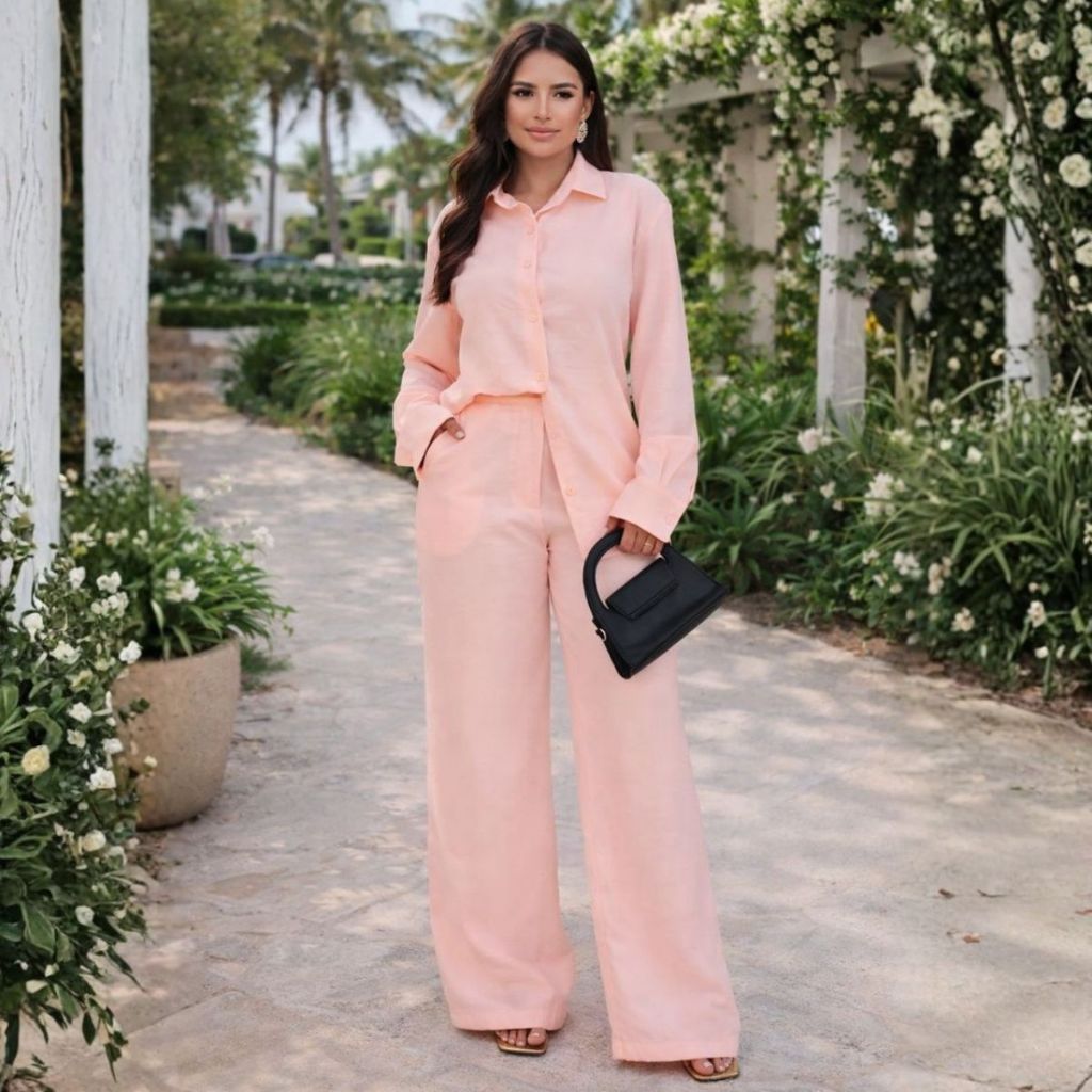 Conjunto Casual Feminino Verão Calça Pantalona e Camisa Manga Longa de Botões Tecido Alfaiataria