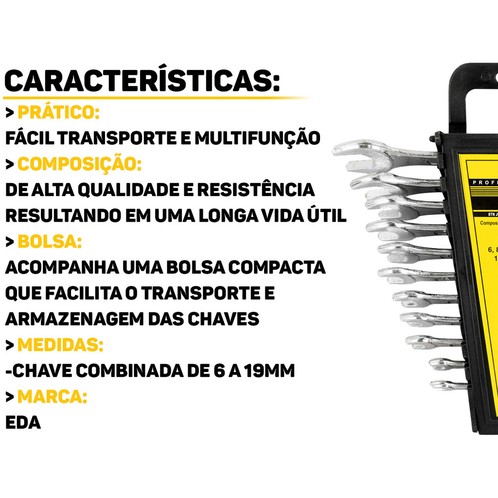 Conjunto Chaves Combinadas 11 Peças Aço Boca Estrela Acabamento Cromado 6mm a 19mm Eda