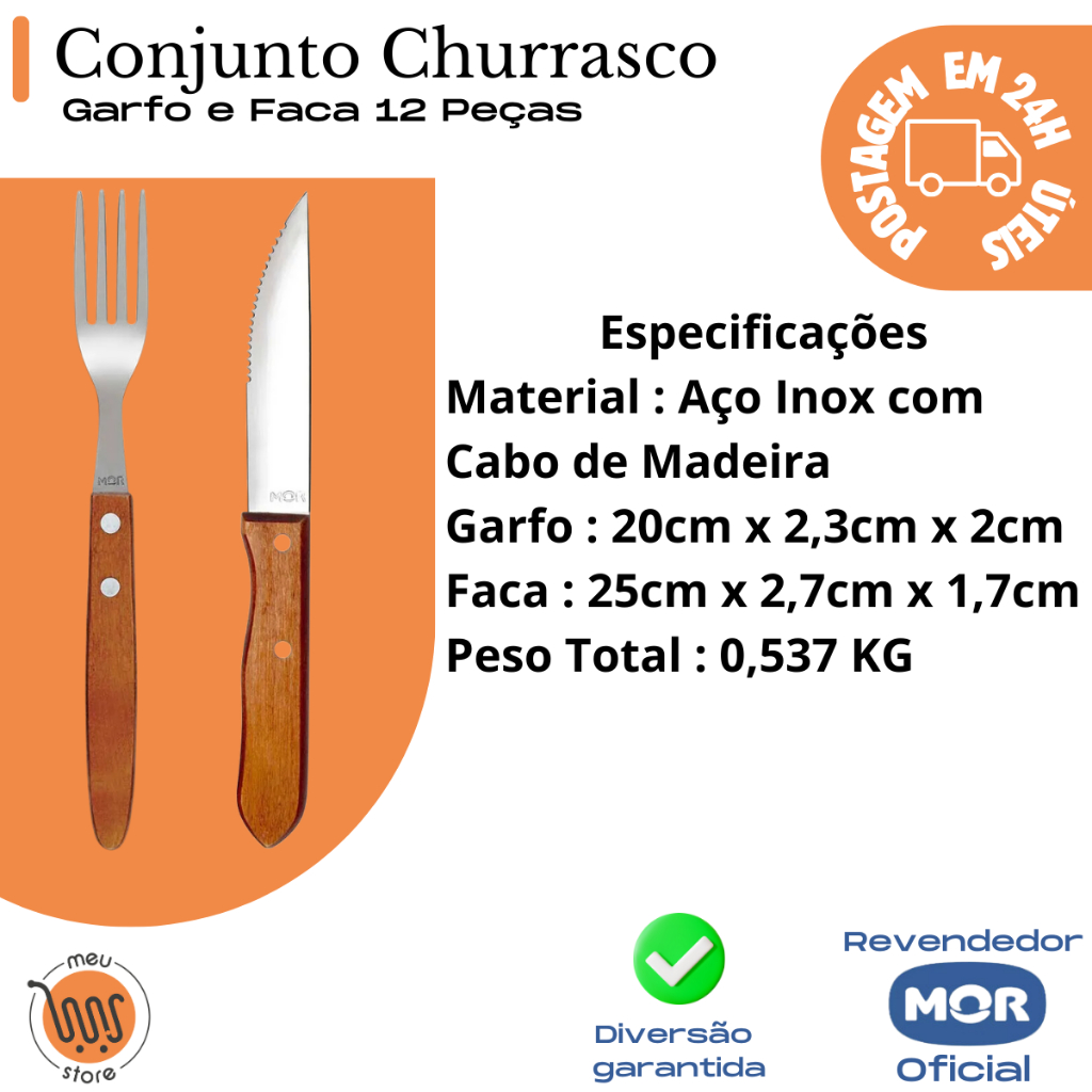 Conjunto Churrasco Garfo e Faca 12 Peças PRODUTO ORIGINAL A PRONTA ENTREGA Composto por seis facas e seis garfos, o Conjunto para Churrasco Garfo e Faca 12 Peças Mor é excelente para fazer parte do seu almoço de domingo reunindo a família e os amigos. Unindo estilo e design, são produzidos em aço inox com cabo em madeira. Extremamente duráveis, permanecem bonitos por muito mais tempo. Diferenciada, a faca de serra possui lâmina mais larga e cabo mais robusto que as facas de modelo tradicional, garantindo o manuseio firme e corte preciso até mesmo nos maiores pedaços de carne. MATERIAL CABO: MADEIRA TAMANHO FACA : 25cm x 2,7cm x 1,7cm TAMANHO GARFO: 20cm x 2,3cm x 2cm PESO TOTAL: 537 GRAMAS MOR Olá! Bem-vindos à MOR! Uma empresa brasileira, que tem como vocação criar soluções inovadoras e de qualidade aos seus consumidores. Nascida no município de Santa Cruz do Sul, a MOR começou como uma empresa familiar, que fabricava produtos para apicultura em uma pequena metalúrgica, no início dos anos 60. Ao longo dos seus 60 anos de história, a empresa cresceu e se consolidou no mercado de produtos para casa, camping e lazer. Hoje, esses produtos fazem parte da vida e história de muitos brasileiros, como as piscinas, cadeiras, churrasqueiras, varais, escadas, térmicos e isotérmicos. Totalizando um mix de mais de 1.600 códigos, divididos em 10 famílias de produtos.