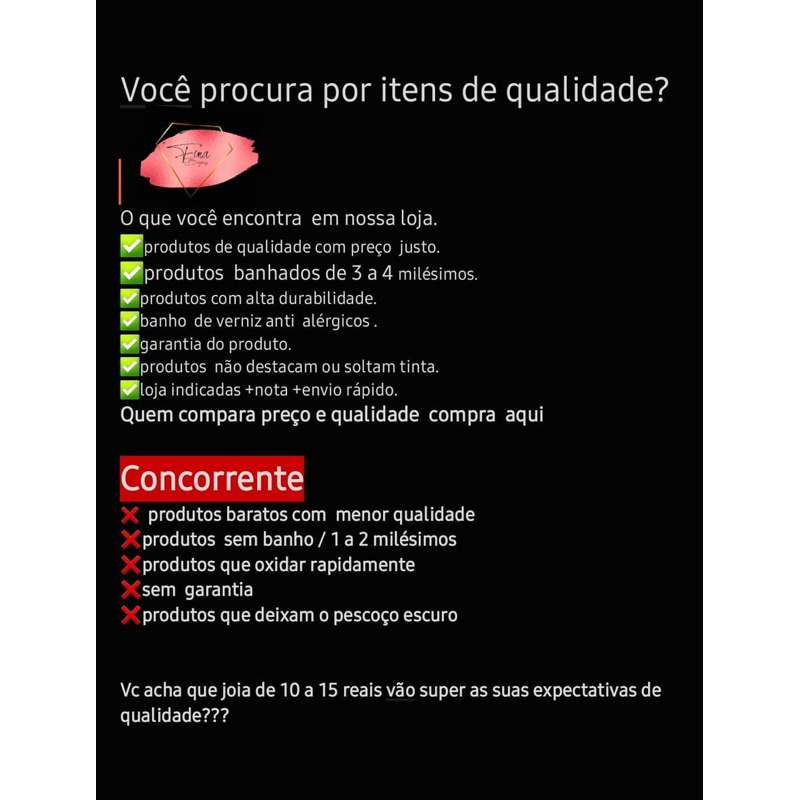Vendido pela loja Fina Bijuox e Acessorios e 5 produtos catalogados aqui no SuperOfertas Brasil. Esta loja ocupa a 96.511ª colocação no ranking de lojas por volume total de vendas registradas (entre 141.909 lojas).
