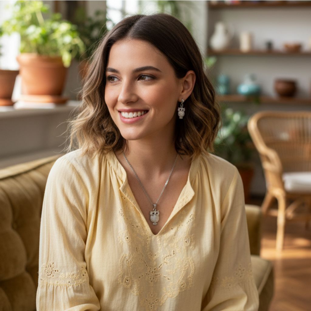 Conjunto Colar + Brinco Coruja Feminino Aço Inox Elegante