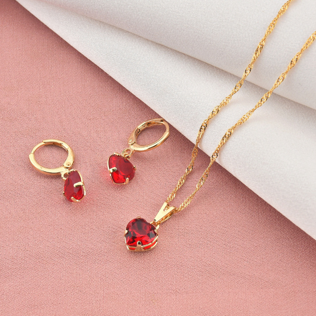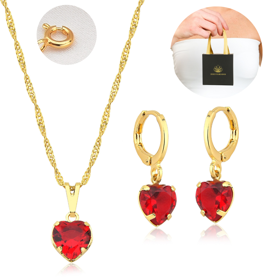 Conjunto Colar e Brinco Feminino Folheado de Ouro 18k Coração Vermelho Semijóia