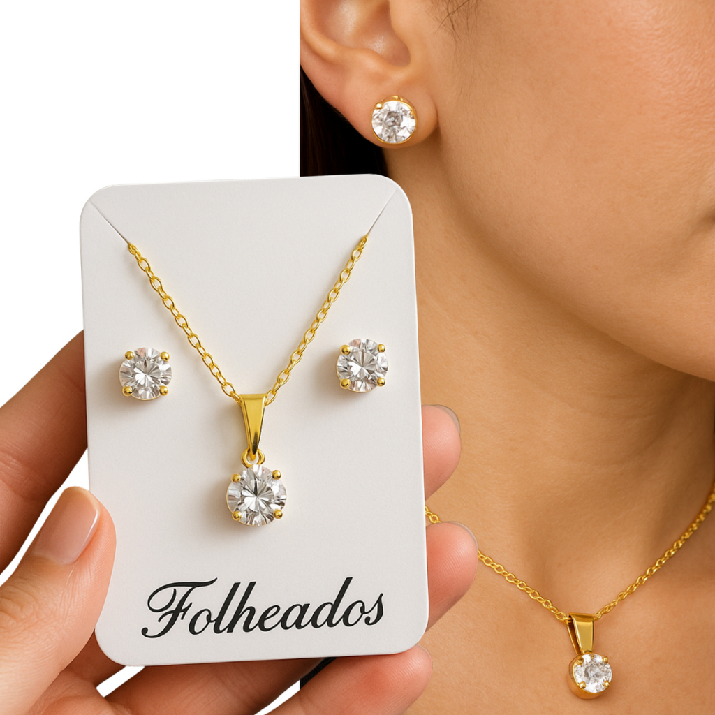 Conjunto Colar e Brinco Ponto de Luz Folheado a Ouro Feminino Pedra Brilhante