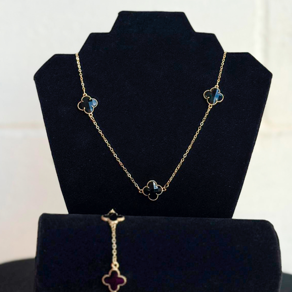 Conjunto Colar e Pulseira Trevo Virginiaa Neymarr Dourado e Preto Folheado a Ouro
