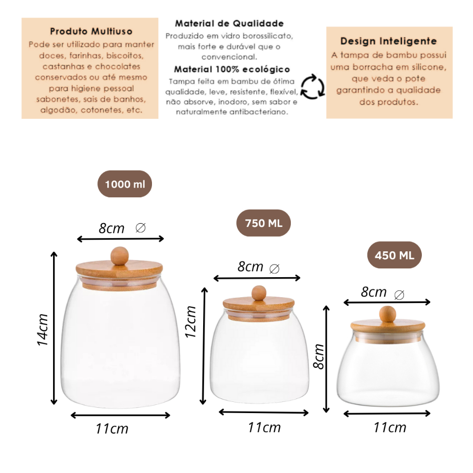 Conjunto com 3 Potes de Vidro Para Mantimentos Pote Hermético tampa de bambu