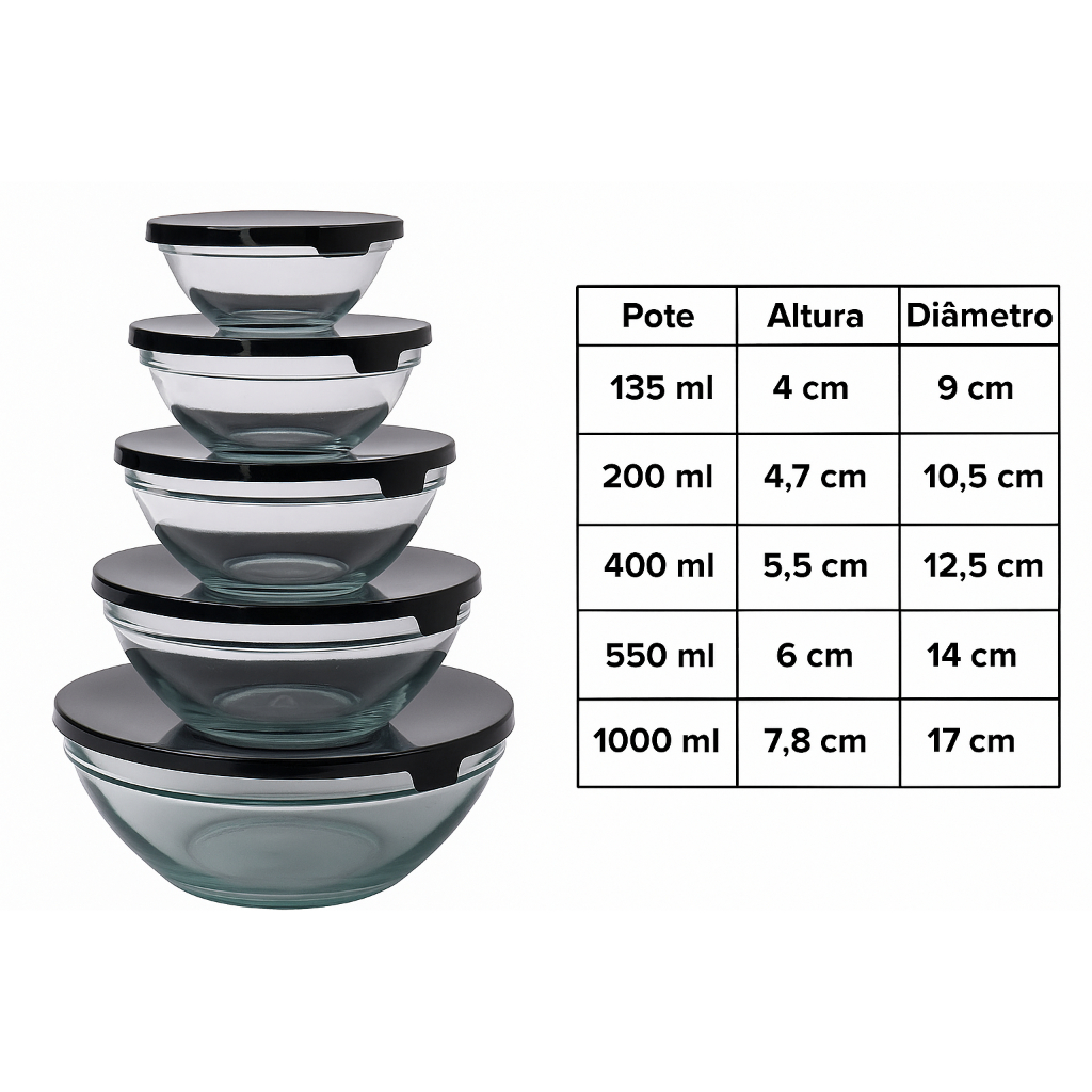 Conjunto com 5 Potes de Vidro com Tampa – Praticidade, Durabilidade e Estilo na sua Cozinha Organize seus alimentos com segurança e estilo usando este completo jogo de potes de vidro com tampa, ideal para armazenar desde porções pequenas até grandes quantidades. Com capacidades variadas e tampas resistentes, é perfeito para uso no dia a dia, geladeira ou para levar alimentos com praticidade. ✅ Vidro de alta resistência térmica e química ✅ Tampas vedadas com ótimo fechamento – conservam melhor os alimentos ✅ Transparente para fácil visualização do conteúdo ✅ Empilháveis – economizam espaço no armário ou na geladeira ✅ Ideal para marmitas, saladas, frutas, sopas, molhos e muito mais 📦 Contém 5 potes com tampa • Capacidades: 135 ml, 200 ml, 400 ml, 550 ml, 1000 ml • Cores das tampas variadas (preto, vermelho ou branco – conforme disponibilidade)".!
