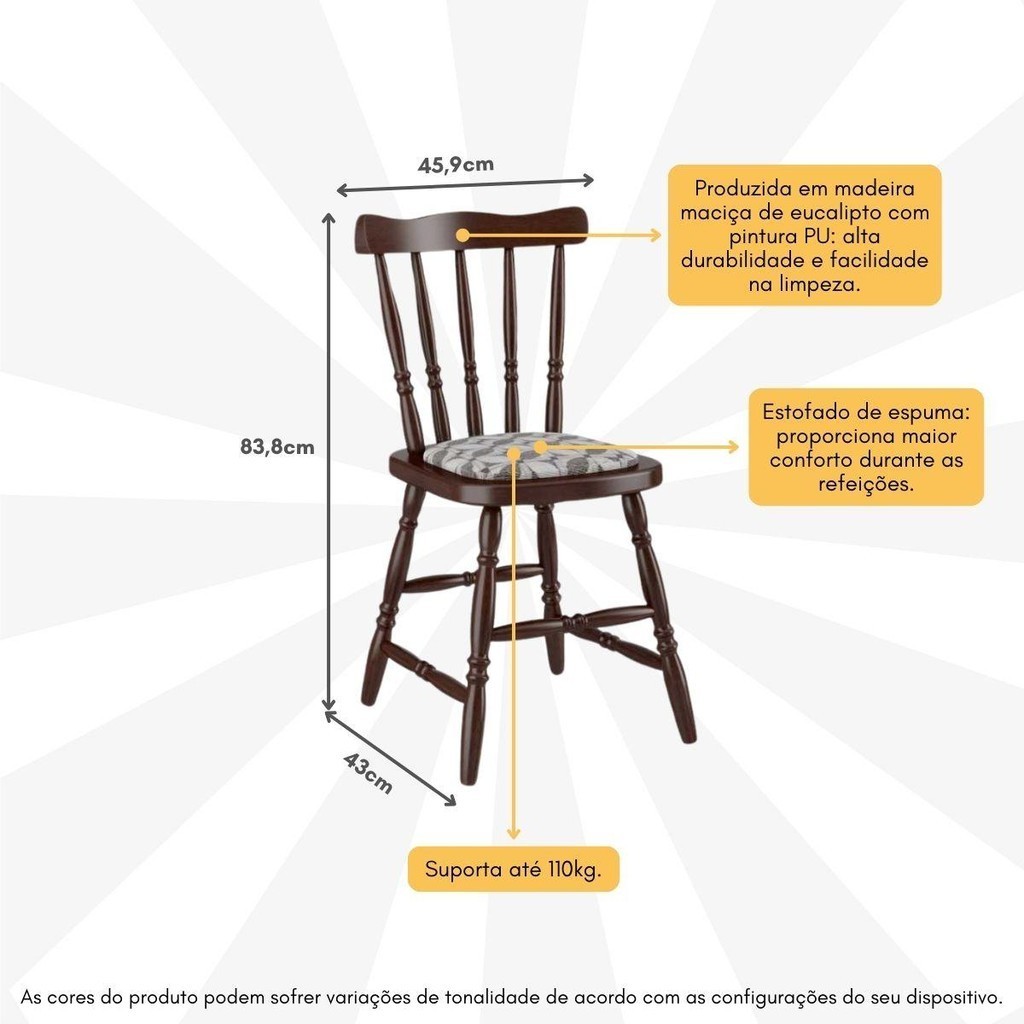 Adicione um toque de classe à sua casa com com o Conjunto com 6 Cadeiras de Jantar Madeira Maciça com Estofado Multimóveis CR50090. É produzido em madeira maciça de eucalipto, garantindo durabilidade e resistência excepcionais. A pintura PU confere um acabamento sofisticado e de alta qualidade, que realça a beleza natural da madeira. As cadeiras (suportam até 110kg) possuem estofado de espuma no assento, oferecendo conforto. O modelo Mel possui revestimento do estofado 100% polipropileno, já o modelo Castanho possui revestimento 70% algodão e 30% poliéster. O design colonial adiciona charme e sofisticação a qualquer ambiente, tornando-as uma escolha perfeita para salas de jantar, cozinhas ou áreas de refeições. Conteúdo da Embalagem: 6 (seis) Cadeiras Dimensões do produto montado: Altura: 83,8cm | Largura: 45,9cm | Profundidade: 43cm *Você pode consultar as medidas detalhadas na imagem técnica do produto. *As cores do produto podem sofrer variações de tonalidade de acordo com as configurações do seu dispositivo. Imagem meramente ilustrativa. Decoração não acompanha o produto. O produto será entregue montado.