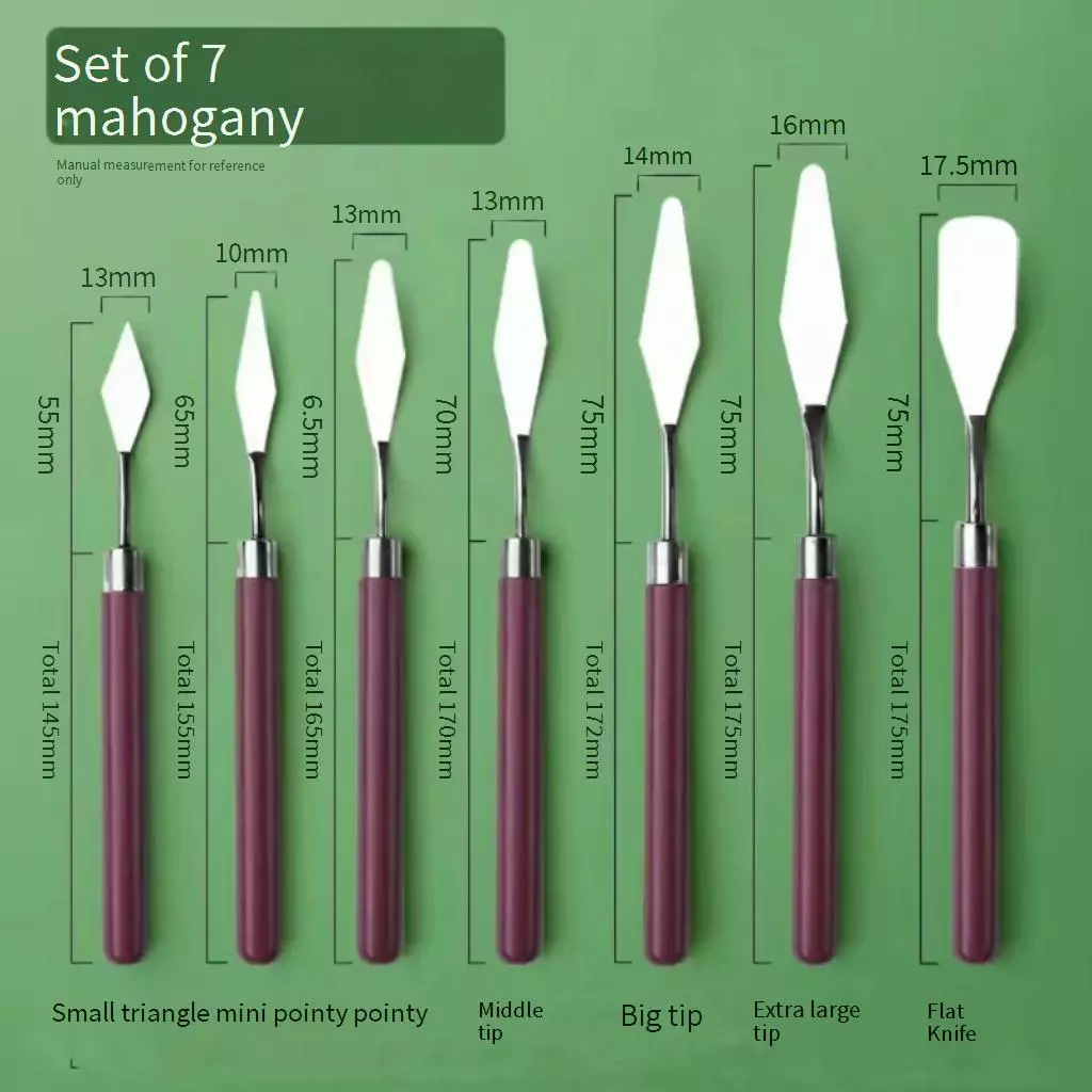Conjunto 7 Espátulas Para Pintura a Óleo – Aço Inoxidável + Cabo em Madeira Mahogany Eleve sua arte com um kit completo de espátulas profissionais! Ideal para pintura a óleo, acrílica, texturas, artesanato, mistura de cores e criação de efeitos em tela. ✨ Características do Produto ✔ 7 peças com formatos variados – perfeitas para mesclar, espalhar tinta, criar detalhes finos e texturas intensas. ✔ Lâmina em aço inoxidável – resistente, flexível e duradoura, apropriada para diferentes técnicas. ✔ Cabo em madeira Mahogany – acabamento confortável, elegante e ergonômico para maior precisão na pintura. ✔ Versátil – indicada para artistas profissionais, iniciantes, estudantes e amantes da arte. ✔ Compatível com: tinta a óleo, acrílica, gesso, texturas, gel, massas, pigmentos e muito mais. Benefícios 🎨 Permite criar efeitos e relevos com facilidade 🎨 Ajuda na mistura e aplicação precisa de cores 🎨 Ferramenta ideal para pintura artística e experimental 🎨 Qualidade premium para maior durabilidade e controle Conteúdo da Embalagem 📌 1 kit com 7 espátulas de pintura
