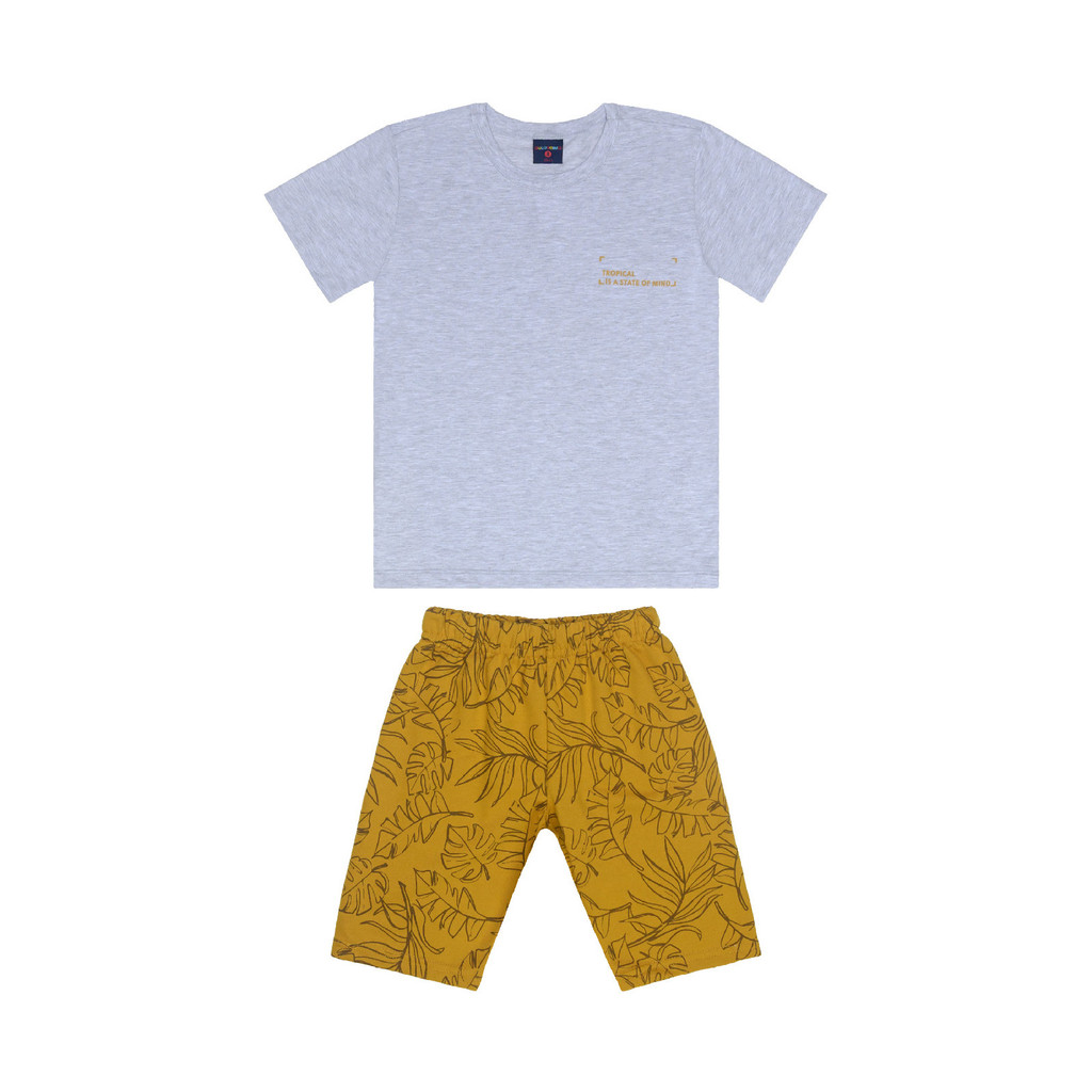 Conjunto infantil para menino, composto por uma camiseta em meia malha e uma bermuda em moletom. A camiseta conta com uma estampa divertida em puff e acabamento em debrum, proporcionando um visual moderno e confortável para as crianças. A bermuda, possui elástico ajustável na cintura, garantindo praticidade e liberdade de movimento durante as brincadeiras. A estampa na bermuda complementa o look, adicionando um toque descontraído.Tecido: Camiseta: Meia Malha (Algodão e Poliéster) | Bermuda: Moletom Sem Felpa (Algodão e Poliéster)Composição: 100% algodão e 50% algodão 50% poliésterModelagem: JustaComprimento Mangas: CurtaComprimento: CurtoForro: NãoCintura: MédiaDecote/Gola: RedondoInformações Extras: Possui estampa de folhasInformações Extras: Possui elástico na cintura