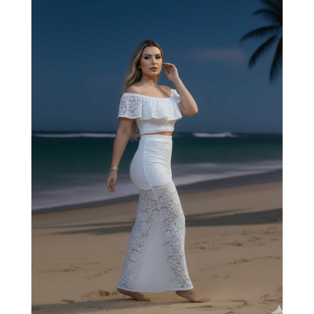 Conjunto Cropped Ombro a Ombro Saia Longa Fenda Lateral Renda Forrada Ano Novo Final de Ano Reveillon