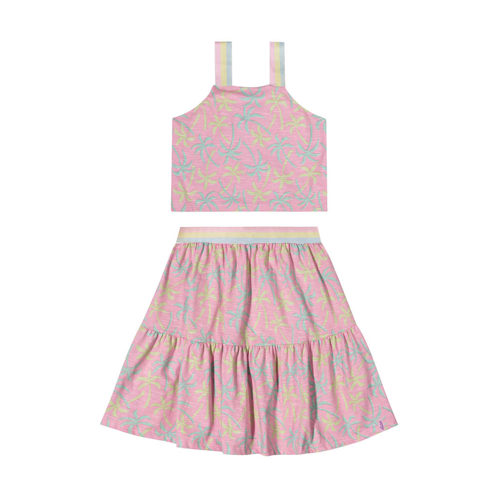 O Conjunto Curto Infantil Menina Tropical Elian traz um visual cheio de estilo e personalidade! Composto por regata e saia em meia malha flamê, as peças oferecem um toque macio e confortável, além de um efeito rajado para um toque moderno. A regata possui alças com tiras largas e listradas, ideal para dar mais segurança em cada movimento, enquanto a saia em modelagem midi conta com elástico no cós, proporcionando liberdade de movimentos, e babados para deixar ela mais volumosa. Além disso, a estampa tropical de coqueiros em ambas as peças traz um visual divertido para passeios em dias ensolarados. Aposte nesse conjunto que é a cara da estação!