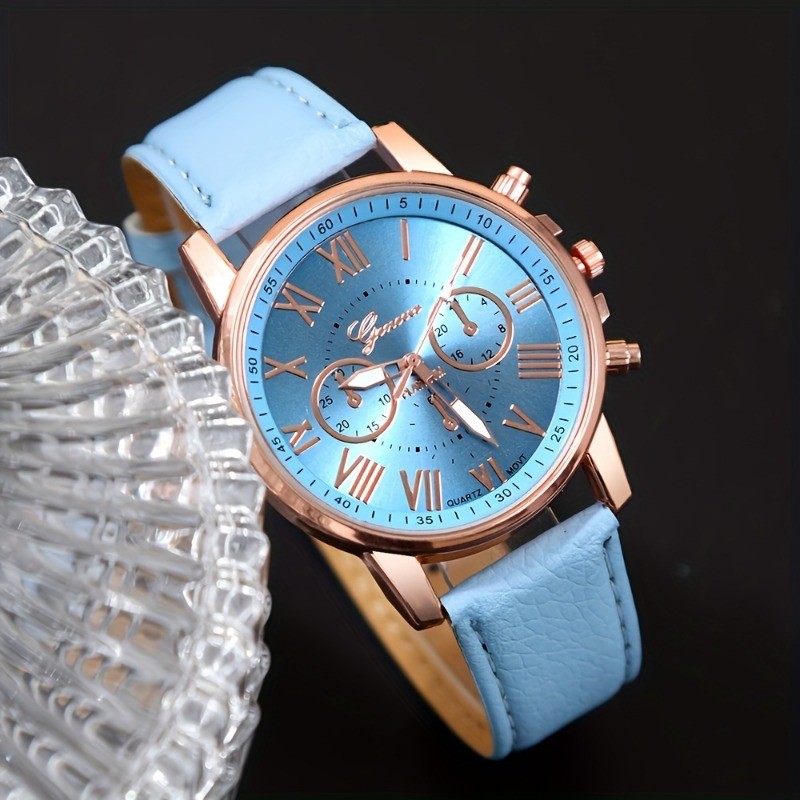 Conjunto De 1 Peça De Relógio De Couro Sintético Feminino Elegante Céu Azul Quartzo Romano E 5 Peças De Acessórios Coraç