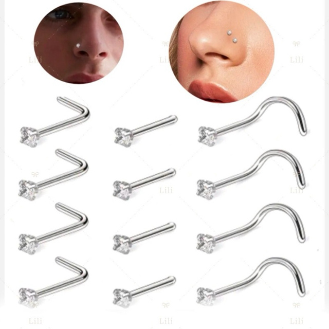 Conjunto de 12 Peças ,Piercing de Nariz em Aço cirúrgico com Zircônia Incrustada