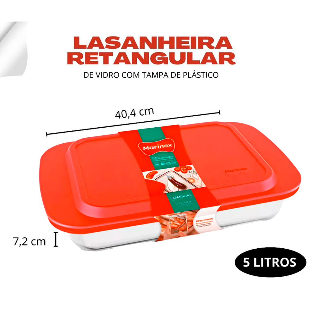 Kit 2x ou 1x TRAVESSA RETANGULAR FUNDA 5 LITROS MARINEX Lasanheira Marinex Com Tampa - 5 Litros Uma peça indispensável para sua cozinha pois é muito versátil, e com um tamanho perfeito. Essa lasanheira irá te surpreender. Marca: Marinex Composição / Material: Vidro (Lasanheira), Plástico (Tampa) Capacidade: 5 Litros Pode ser levado ao Micro-ondas: Sim Pode ser levado ao forno: Sim Pode ser levado a lava-louças: Sim Conteúdo da Embalagem: 2 Lasanheira, 2 Tampa Dimensões aproximadas do Produto: Altura 8cm x Largura 24cm x Comprimento 40cm material que permite uma distribuição uniforme de calor, garantindo um cozimento perfeito. é um dos mais populares da linha Marinex, apreciado tanto por chefs profissionais quanto por cozinheiros domésticos. CONTEUDO>[ 2X TRAVESSA COM TAMPA ou 1x TRAVESSA COM TAMPA