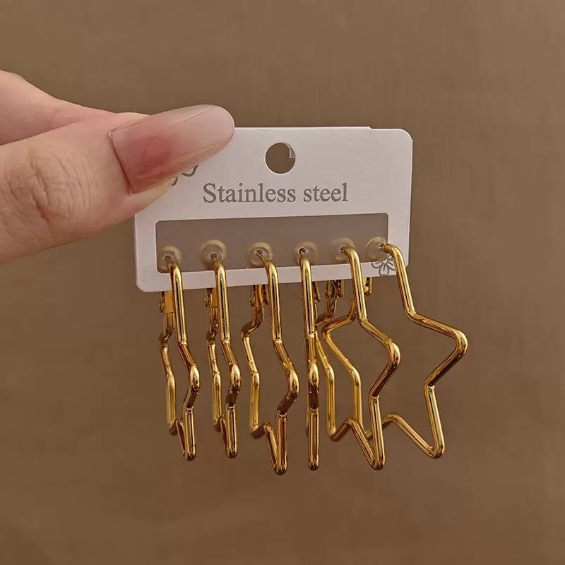 Conjunto de 3 pares de brincos de aço inoxidável de estrela de cinco pontas, incluindo grandes, médios e pequenos