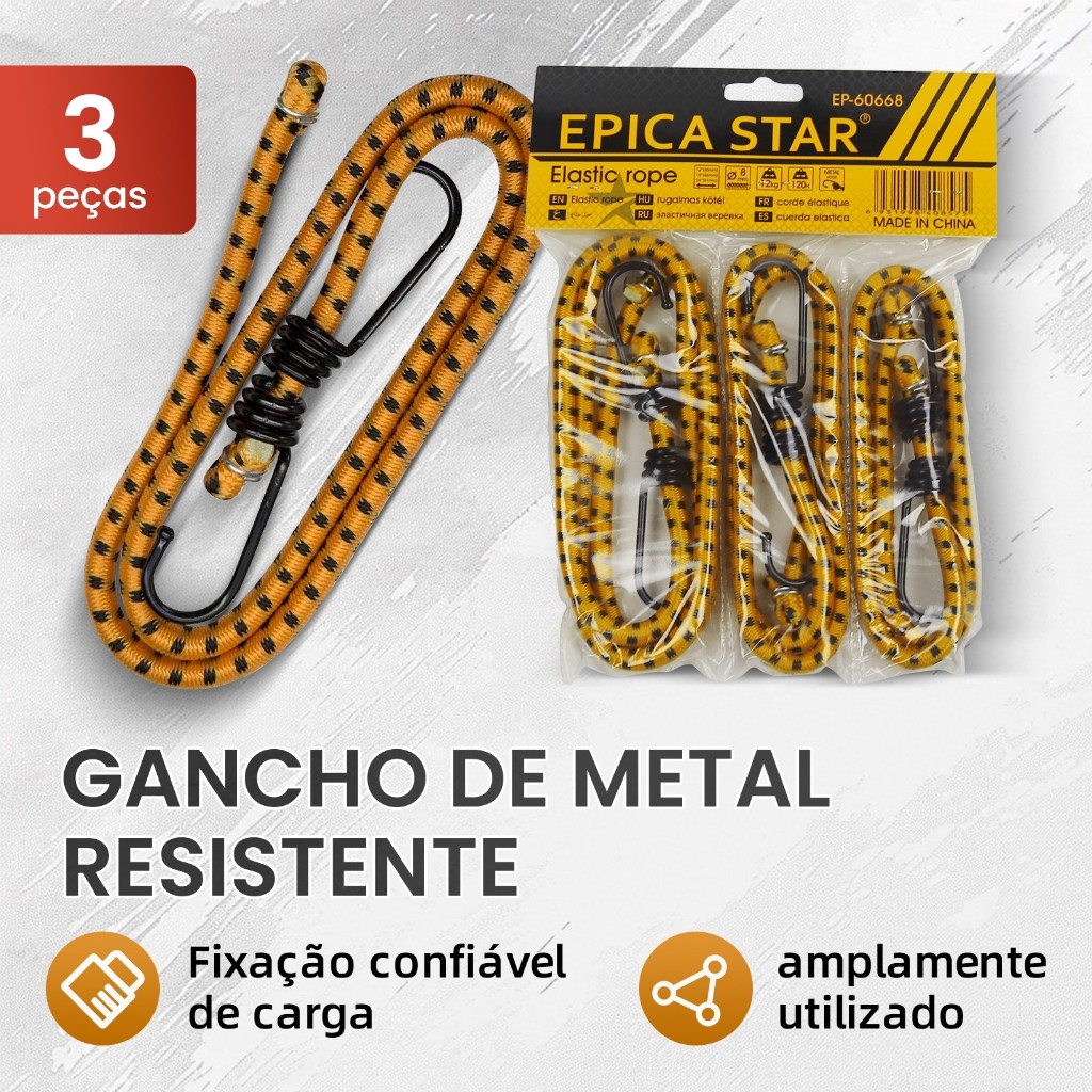 Título do Produto ✨Kit com 3 Cordões Elásticos EPICA STAR🌟 Gancho Metálico Super Durável, Suporte de Carga 12KG, Aplicável em Múltiplas Cenas🥳 Detalhes do Produto Descrição do Produto 🎉Os cordões elásticos EPICA STAR, com 3 unidades em um kit, são simplesmente ótimos ajudantes para fixar cargas~Equipados com ganchos metálicos robustos, não precisam de conectores adicionais, podendo ser usados diretamente, super convenientes~O diâmetro do cordão é de 8 mm, podendo suportar uma carga de 12 kg, seja para fixar itens em carros leves, caminhões, bicicletas, carrinhos, motocicletas ou para organizar bagagens, todos podem ser segurados com facilidade~ São feitos de nylon, com boa elasticidade, resistência ao desgaste e antienvelhecimento, além de alta elasticidade e grande tenacidade, podendo fixar firmemente as mercadorias, evitando que elas deslizem ou se danifiquem~Seja para uso diário ou em cenários ao ar livre, são特别 adequados, trazendo muita segurança para a fixação de objetos~ Características - Gancho Metálico Super Durável**: Ganchos metálicos robustos, com fixação de carga super confiável e ampla aplicabilidade~ - Excelente Material**: Feito de nylon, com boa elasticidade, resistência ao desgaste e antienvelhecimento~ - Desempenho Notável**: Alta elasticidade e grande tenacidade, garantindo que as mercadorias sejam firmemente fixadas~ - Aplicável em Múltiplas Cenas**: Aplicável em diversos cenários como carros leves, caminhões, bicicletas, carrinhos, motocicletas, fixação de bagagens, etc.~ - Especificações Adequadas**: Diâmetro de 8 mm, suporta 12 kg de carga, com 3 unidades por kit, atendendo a diversos requisitos de fixação~