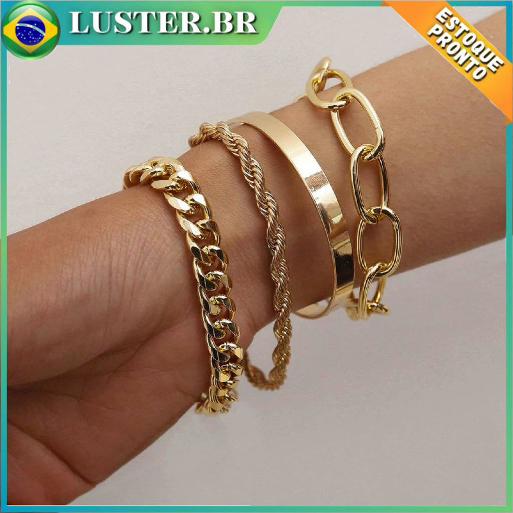 Conjunto de 4 pulseiras em camadas com correntes grossas - Ajustáveis, simples e empilháveis - Lucky Jewelry Gift integra a oferta da Shopee Brasil na subcategoria Pulseiras e Braceletes (de Acessórios de Moda) por R$ 21,99 (64% de desconto sobre o preço original de R$ 61,08). Com avaliação de 4.7 de 5 estrelas e 110 unidades vendidas, este produto se destaca pelo excelente custo-benefício.