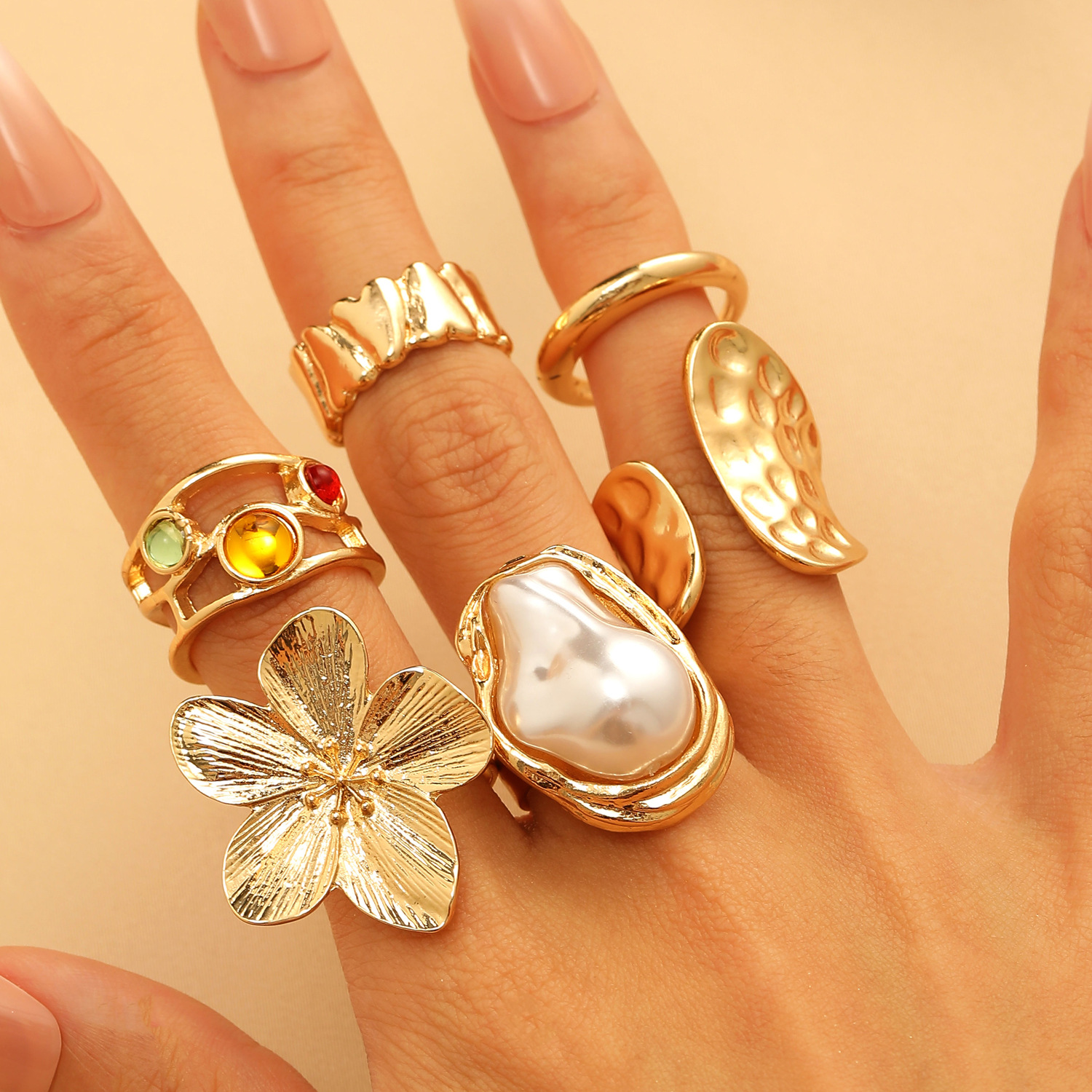 Conjunto De 6 Anéis De Flor De Lava Líquida – Joias Vintage Banhadas A Ouro Pérola Ajustável Para Presente Mulheres