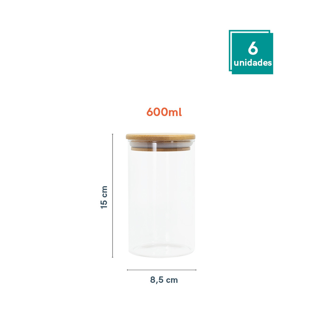 Conjunto de 6 Potes de Vidro Herméticos de 600 ml com Tampa de Bambu