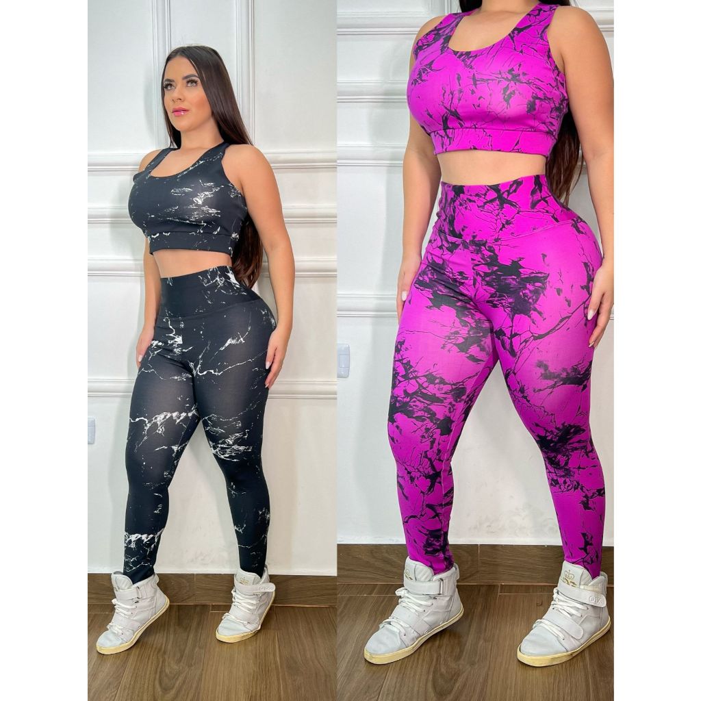 Conjunto De Academia Degrade Marmorizado Raio Fitness Moda Feninino Calça Leg Legging Com Top Nadador Estampados