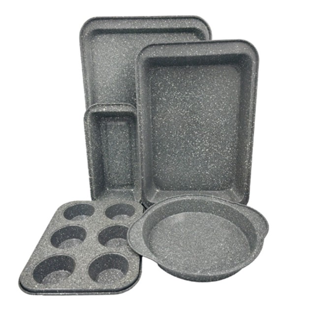 Conjunto de assadeiras 5 peças com revestimento antiaderente Dartmore - Oster Assadeiras rasas são ideias para confecção de biscoitos, cookies, pão de queijo e muitos outros pratos de consumo individual. Sabendo disso, a Oster produz um kit contendo 3 assadeiras com tamanhos diferentes para atender diferentes demandas. O acabamento marmorizado das 3 assadeiras, além de muito charme e muita beleza, confere às peças camadas internas antiaderentes que evitam que o alimento grude na superfície (facilitando a limpeza). O acabamento marmorizado de todo o conjunto, além de muito charme, confere às peças camadas internas antiaderentes que evitam que o alimento grude na superfície. Um conjunto completo de assadeiras é perfeito para todas as suas receitas. De diferentes tamanhos prontos para qualquer necessidade. Possui uma construção altamente resistente e durável de aço carbono com revestimento antiaderente de alta qualidade, trazendo a segurança de não sofrer danos com o uso a longo prazo. As assadeiras não apresentam dificuldades para realizar sua lavagem. É recomendado evitar materiais abrasivos, a fim de não prejudicar suas propriedades antiaderentes. ESPECIFICAÇÕES Linha: Dartmore Material: Aço carbono Revestimento antiaderente Cor: Cinza Marble Marca: OSTER RECOMENDAÇÕES Pode ser lavado na máquina de lavar louça, mas é recomendado lavar à mão. Composição: 1 Assadeira de Biscoitos 42cm x 28,5cm 1 Assadeira 37,5cm x 25,2cm 1 Assadeira com capacidade para 6 Muffins/Cupcakes27cm x 20,2cm x 3cm 1 Assadeira Redonda para Tortas 28,5cm x 24,5cm 1 Assadeira para pão 25,5cm x 13cm Aproveite nossas ofertas, as entregas estão voando!