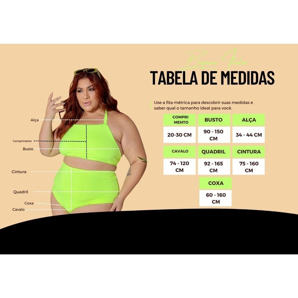Tamanho Único Plus Size – Veste do 48 ao 56 O Biquíni Itália foi feito para quem busca plus size de verdade com conforto, firmeza e segurança. Produzido em suplex duplo, com forro duplo, ele não fica transparente e entrega um caimento impecável, valorizando o corpo sem marcar. A calcinha é cintura alta, modela a região da barriga, não enrola e oferece mais sustentação. O top possui alça fina e ótima sustentação, trazendo conforto e segurança para curtir praia e piscina com tranquilidade. Principais benefícios (sem surpresas) Tamanho único plus size: veste do 48 ao 56 Suplex duplo: tecido encorpado, firme e confortável Forro duplo: mais segurança e zero transparência Calcinha cintura alta: modela, segura e não enrola Top com ótima sustentação e alça fina Não marca e não fica transparente Ideal para praia, piscina e viagens Tecido Suplex Duplo (objeções resolvidas) O suplex duplo é um tecido encorpado, com elasticidade e toque confortável, perfeito para moda praia plus size porque: não fica transparente mesmo molhado dá mais firmeza no corpo não perde a forma com facilidade veste com segurança sem apertar demais Medidas do produto (Tamanho Único Plus Size) Busto: 90 a 150 cm Cintura: 75 a 160 cm Quadril: 75 a 160 cm Obs.: As medidas variam porque o tecido possui excelente elasticidade, se adaptando ao corpo com conforto. Detalhes do produto Nome: Biquíni Itália Categoria: Moda praia feminina plus size Tamanho: Único plus size (veste do 48 ao 56) Material: Suplex duplo Forro: duplo Top: alça fina, com ótima sustentação Calcinha: cintura alta, confortável e modeladora Dica para comprar com segurança Compare suas medidas de busto/cintura/quadril com as medidas informadas no anúncio. O tecido tem elasticidade e foi desenvolvido para vestir plus size real do 48 ao 56 com conforto.