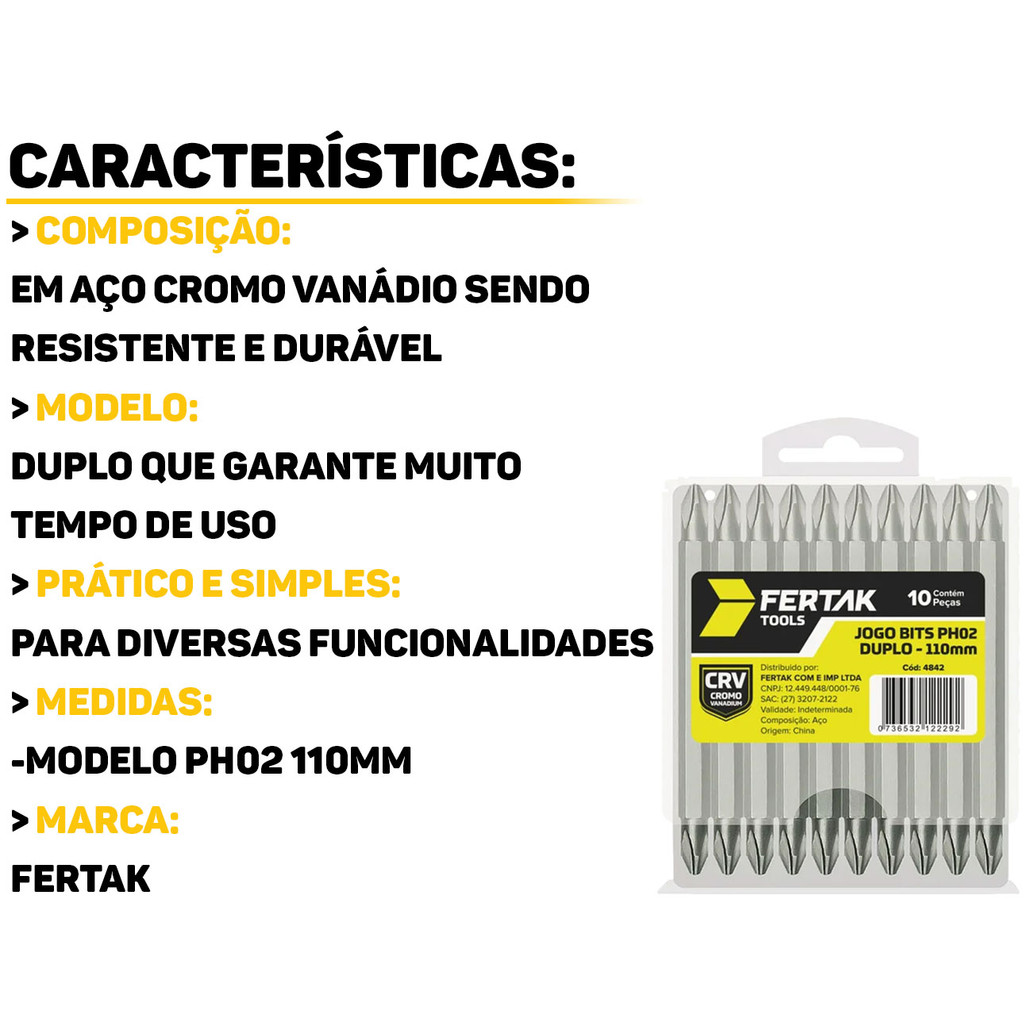 Jogo De Bits Duplo 110mm 10 Peças Fertak O Jogo De Bits Duplo da Fertak é uma solução prática e indispensável para quem busca qualidade e versatilidade em suas tarefas. Ideal para uma variedade de aplicações, desde pequenas reparações, até projetos mais complexos. Adquira o seu e aumente sua produtividade com estes bits que se adaptam perfeitamente à sua furadeira, tornando cada tarefa mais rápida e fácil. Características: > Fácil aplicação e manuseio; > Utilizado para soltar e apertar parafusos; > Peças produzidas em aço cromo vanádio; > O kit acompanha 10 peças com pontas duplas nas medidas PH02. - Marca: Fertak - Garantia: 90 dias contra defeitos de fabricação Vantagens de comprar na Brester: - Produto a pronta entrega. - Produto novo, com garantia de fábrica. - Nota fiscal para Pessoa Física e Pessoa Jurídica.