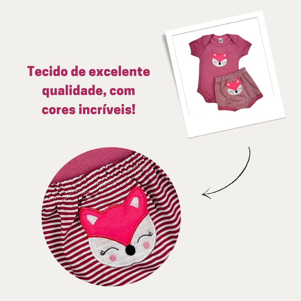 Mamãe e papai, esse lindo conjunto foi criado pensando no seu bebe. Com estampas exclusivas, você consegue fazer várias outras composições de looks. Prezamos SEMPRE pela QUALIDADE e CONFORTO na fabricação dos nossos produtos. Bodyes: O bodye é uma peça super estilosa e fofa, sendo indispensável no enxoval de qualquer recém nascido. Foram desenvolvidos em manga longa e com as golas corte americano. Short O short é super confortável e não machuca o seu bebê. Material: Body: Suedine 100% Algodão Short: Malha Pula Pula Bebê 100% Algodão -Macio e gostosa de usar -Não tem eletrostática -A pele do bebê respira sem dificuldades e não provoca alergias. TAMANHOS: (Tabela de tamanhos disponível nas fotos) - ( P ) - 0 a 3 meses - ( M ) - 4 a 7 meses - ( G ) - 8 a 12 meses Os tamanhos podem variar de 1 a 2 cm para mais ou para menos de acordo com a tabela de medida Embalagem: 01 Conjunto de Body e Short (escolha a estampa) Recomendações: Produto 100% algodão portanto necessita cuidados ao lavar; Lavar com cores semelhantes, não torcer, secagem à sombra; Não alvejar; Não usar secadora Usar ferro até 150°;