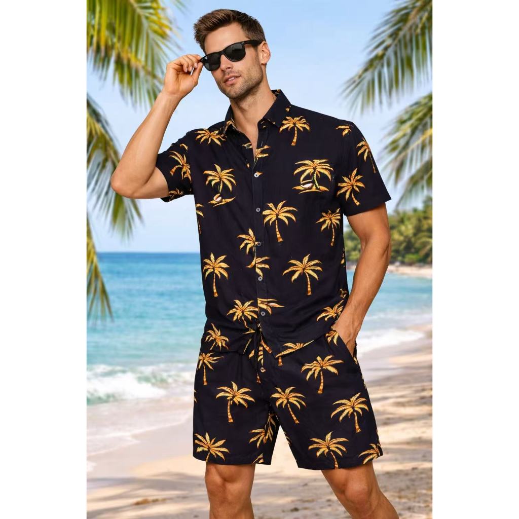 Conjunto de camisa e shorts com estampa floral havaiana (três bolsos) para adultos masculinos de viscose