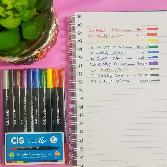 Conjunto de canetas Brush Cis Dualtip Marcador Artístico Aquarelável com 10 cores Indicada para escrita brush e coloração. Possui alto poder de cobertura e ótima durabilidade. Cores vibrantes e resistentes à luz. - Marcador Artístico DualTip - Caneta com duas pontas, uma Extrafina e outra Brush - Tinta à base de água - Ponta pincel de tamanho médio - Ponta Extrafina de 0,4mm - O Kit contém 10 Brush Pen - Aquarelável - Ótima escolha para quem procura qualidade e versatilidade - Atóxica - Ponta extrafina - Traço de 0.4mm - Tinta à base de água. - Marca: CIS - Embalagem: Blister com 10 cores Produto original Cores: - Preta - Cinza - Azul claro - Azul escuro - Vermelho - Amarelo - Verde - Laranja - Violeta - Marrom