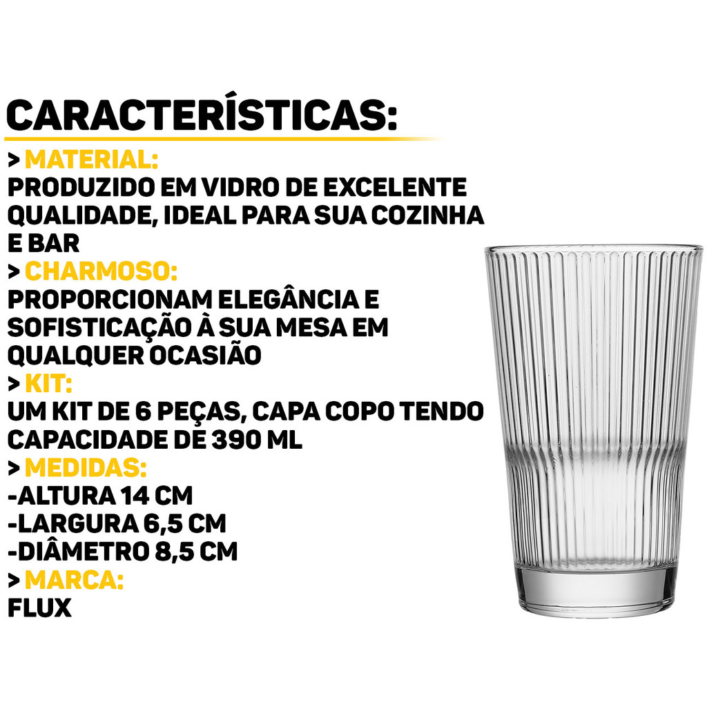 Conjunto De Copos De Vidro Para Água Suco Refrigerante Vitamina 6 Unidades 390ml Flux