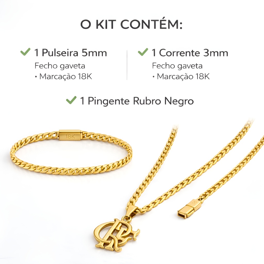 CORRENTE FLAMENGO 3x1 – FIGARO 2.6MM + PULSEIRA Moeda Antiga | Fecho Gaveta com Marcação 18K | Alta Qualidade DETALHES DA CORRENTE: Modelo: Figaro 3x1 Material: Moeda Antiga Espessura: 2.6 mm Comprimento: 60 cm Fecho tipo gaveta com marcação 18K Cor semelhante ao ouro 18K Excelente banho e acabamento DETALHES DA PULSEIRA: Modelo: Figaro 3x1 Material: Moeda Antiga Fecho tipo gaveta com marcação 18K Combina com a corrente (mesmo modelo e material) POR QUE ESCOLHER NOSSO PRODUTO? Alta qualidade e acabamento profissional Cor fiel ao ouro 18K Não enferruja Pode molhar Produto com excelente durabilidade Design que se destaca ENVIO RÁPIDO Postagem em até 15 horas úteis após a confirmação do pedido. QUEM SOMOS Mais de 20 mil vendas realizadas na Shopee com reputação sólida. Atendemos com agilidade e sempre priorizamos a qualidade dos nossos produtos. Ficou com dúvida? Envie sua pergunta pelo chat, responderemos o mais rápido possível. Se quiser, posso também montar o título ideal para o anúncio, com foco em SEO e clique. Quer?