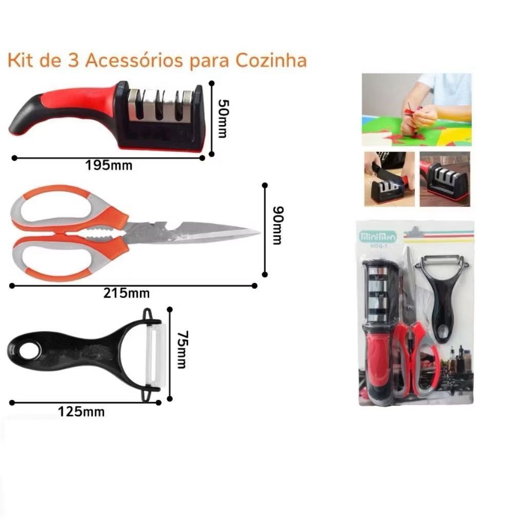 Conjunto de Cozinha Completo 3 peças Tesoura Inox Afiador Descascador