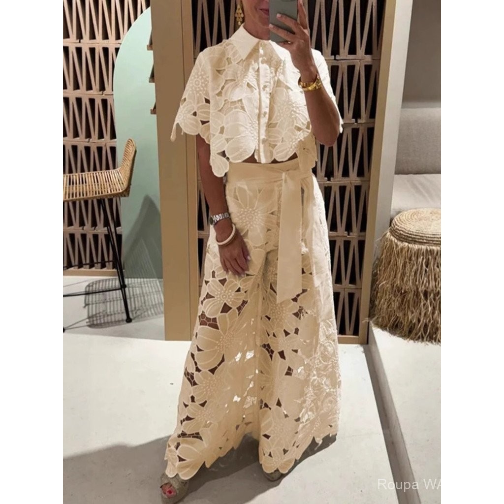 Conjunto de duas peças feminino: camisa casual de renda com recortes e calças compridas