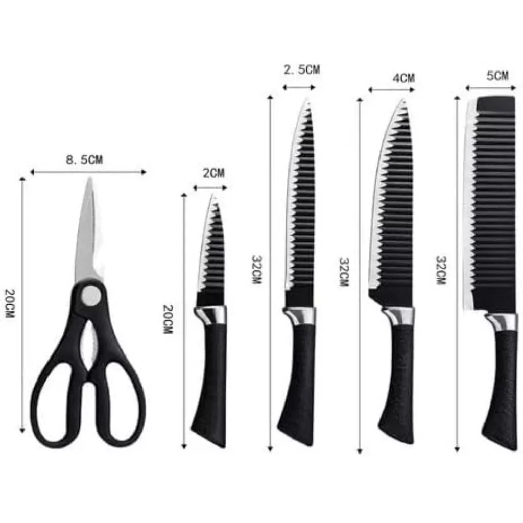 Este conjunto de facas de corte conta com seis peças em revestimento antiaderente, lâminas super afiadas e lindo design, na cor preta. O cabo ergonômico garante maior segurança no manuseio, melhor desempenho e maior precisão no corte da carne. São peças de aço inox com grande durabilidade e alta qualidade, garantindo um corte perfeito e equilibrado das carnes. As lâminas são selecionadas para usos específicos, tornando esse conjunto adequado para uso em todos seus preparativos culinários no dia a dia da sua cozinha, bem como no churrasco de final de semana. Tenha em sua cozinha um equipamento de qualidade! Especificações Do Produto: - Cabo em plástico; - Cabo na cor preta; - Lâmina em aço carbono. Recomendações: - Mantenha sua faca sempre afiada e seca; - Produto cortante e perfurante; - Mantenha fora do alcance das crianças. Cuidados: - Lave com detergente neutro e enxágue com água - Limpar em abundância; - Para secar, utilize um pano seco e macio; - Evite o uso de produtos abrasivos. Produto Acompanha: - 1 Faca de Cozinha - 1 Faca para Fatiar - 1 Faca para Chef - 1 Faca de Aparar - 1 Descascador De Legumes - 1 Tesoura Dimensões aproximadas da embalagem: (C) 21cm x (L) 36cm x (A) 3cm. Peso aproximado: 880g.