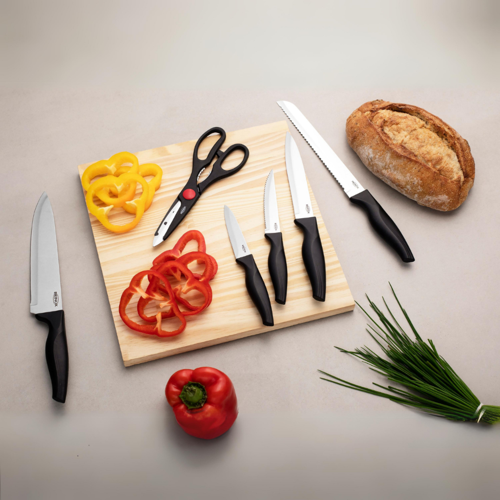 Seja Bem-Vindo(a) à Mimorada! Com lâmina em aço inoxidável com tratamento térmico (temperado) e acabamento polido. Proporciona uma excelente afiação em todas as facas, ideais para todos os tipos de corte. Todas as facas entregam durabilidade e eficiência durante o uso, a partir de suas lâminas em aço inoxidável temperadas. Os cabos ergonômicos em polipropileno, na cor preto com textura antiderrapante, são excelentes para uso diário no preparo de alimento, proporcionando maior praticidade durante o corte e limpeza da faca. -Material: Aço Inox + Plástico -Composição: 01 Conjunto facas 6 peças Cross 01 Faca para Carne 8" 01 Faca para Pão 8" 01 Faca para Cozinha 6" 01 Faca Multiuso 4 1/2" 01 Faca para Legumes 3 1/2" 01 Tesoura