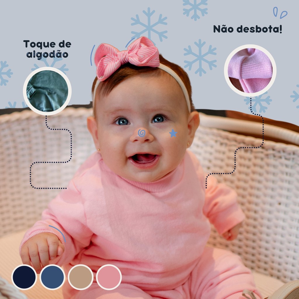 Conjunto de Moletom Infantil: Estilo e Conforto para os Pequenos O Conjunto de Moletom Infantil oferece conforto e estilo para os dias frios, sendo perfeito para o dia a dia, passeios e momentos de lazer. Composto por uma blusa e uma calça de moletom, mantém as crianças quentinhas sem abrir mão do charme. A blusa de moletom, confeccionada em tecido macio e felpado, garante máximo conforto. Já a calça, também em moletom de alta qualidade, possui cós elástico ajustável, facilitando o vestir e proporcionando excelente caimento. Principais Características: Blusa e calça de moletom felpado Tecido macio e quentinho Cós elástico e ajustável na calça Disponível em diversos tamanhos para todas as idades Idade Recomendada: P: 0 - 3 meses, M: 3 - 6 meses, G: 6 - 9 meses, GG: 9 - 12 meses, 1: 12 - 24 meses, 2: 2 à 4 anos, 4: 4 à 6 anos. (Idade sugerida, recomendamos seguir tabela de tamanhos.) Cuidados Especiais: Lavar à mão ou na máquina com água fria Utilizar sabão neutro Secar à sombra Passar em temperatura baixa Não lavar a seco Lavar separadamente de outras peças de cores diferentes devido ao tingimento Principais Dúvidas: O conjunto é confortável para as crianças? Sim, o moletom felpado proporciona máximo conforto. A calça possui cós elástico ajustável? Sim, o cós elástico facilita o vestir e garante um bom caimento. Qual a idade recomendada para cada tamanho? Consulte nossa tabela de tamanhos para garantir o ajuste perfeito. Com o Conjunto de Moletom Infantil, as crianças estarão sempre prontas para enfrentar o frio com estilo e diversão! Garanta já o seu e aqueça os pequenos com muito charme.