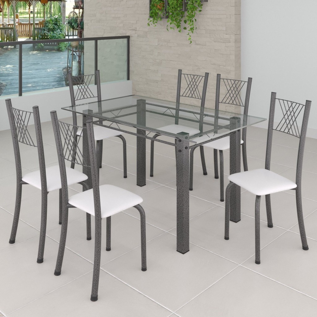 Conjunto de Jantar Mesa 140x75cm Tampo de Vidro Incolor com 6 Cadeiras Sara Yescasa Branco/Prata